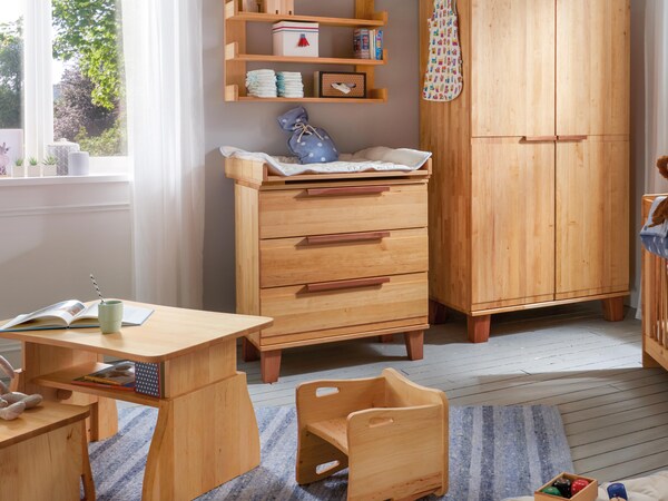 Darüber hinaus finden Sie bei uns Massivholz Kommoden aus Buchen-, Birken- oder Erlenholz. Sie können nach Ihrem eigenen Geschmack entscheiden, welches Holz in Ihr Kinderzimmer passt.