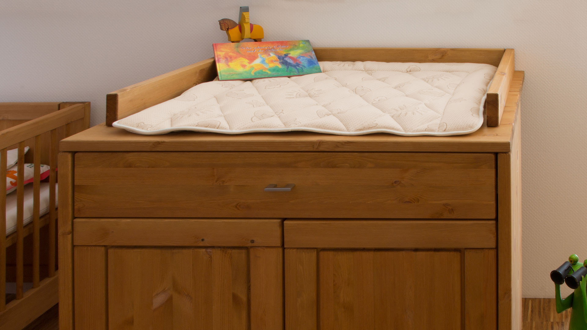 Die voluminöse Randrolle schafft einen weichen Übergang zu dem starren Wickelkommoden-Rahmen und schützt so das Köpfchen Ihres Goldschatzes behutsam vor Stößen. Die aufwändige Rauten-Steppung wird durch ausgewählte Motive geziert - Sie haben die Wahl zwischen den fröhlichen und lustigen Motiven "Sonne & Mond" oder "Hände". Diese Wickelauflage erhalten Sie exklusiv nur bei allnatura.