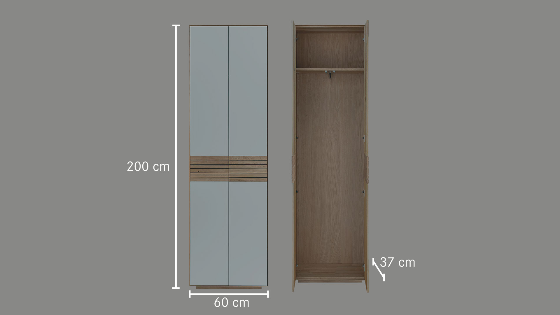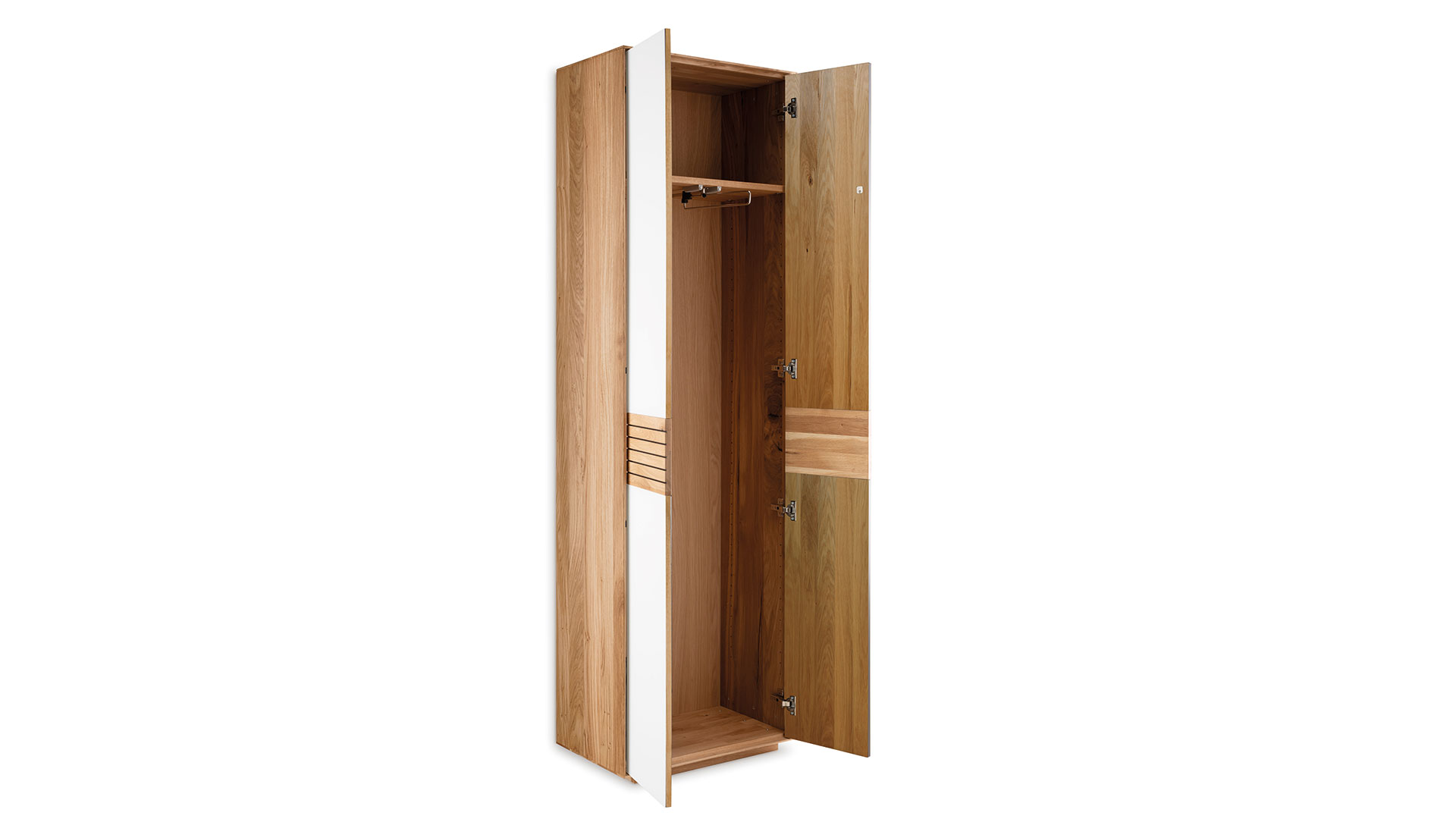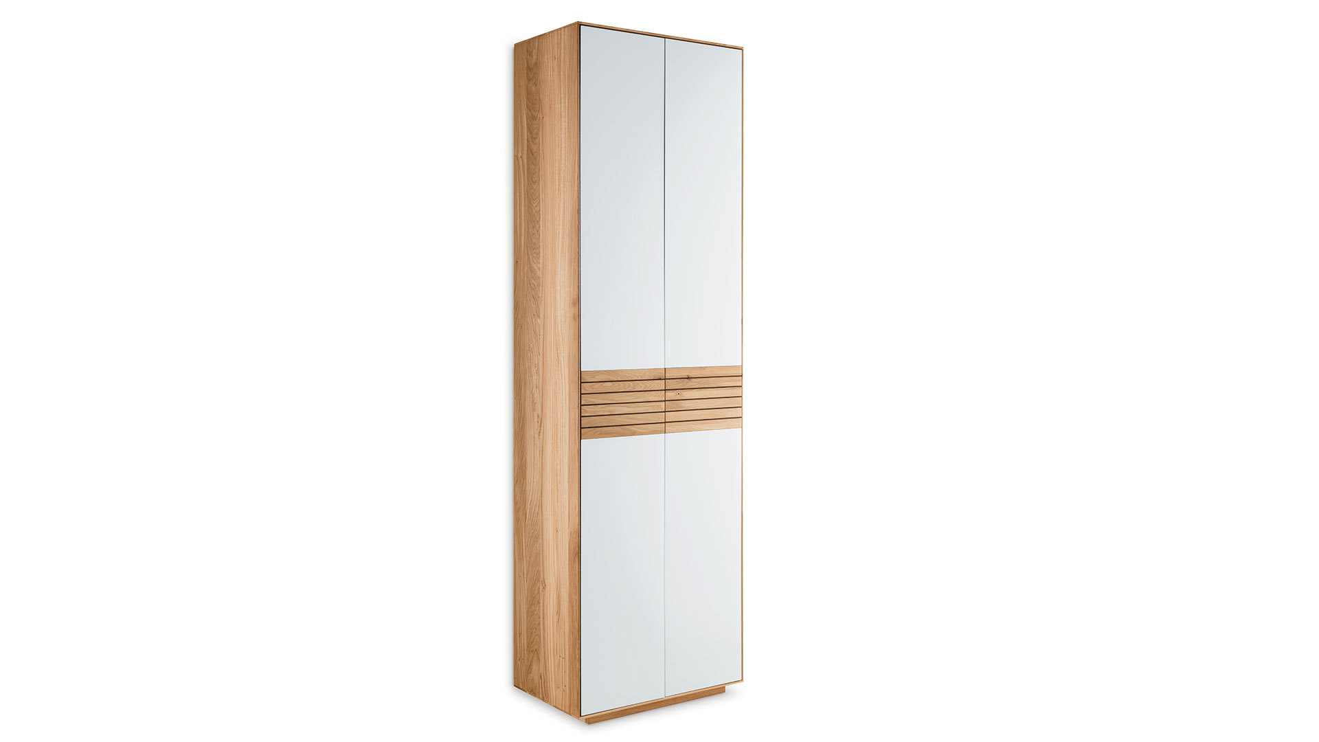Mit dem Dielenschrank "Fiella" setzen Sie im Eingangsbereich ein Zeichen für Natürlichkeit und zeitlose Eleganz. Die massive Wildeiche des Schranks überzeugt mit ihrer lebendigen Maserung und einer warmen Ausstrahlung. Die satinierten Weißglastüren sorgen für freundliche Helligkeit, während die Bauchbinde aus Massivholz mit schwarz gebeizten Rillen einen wirkungsvollen Kontrast setzt.