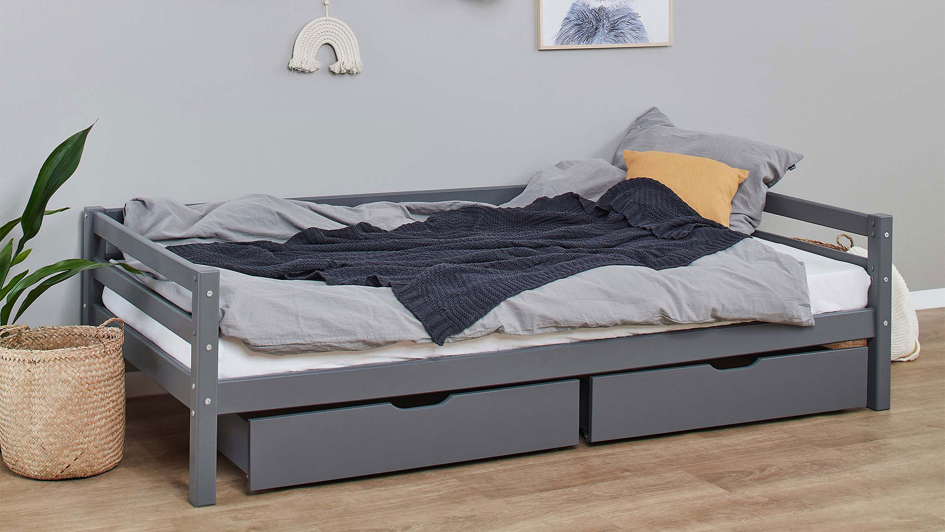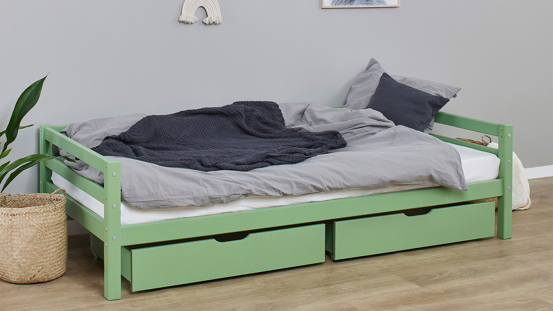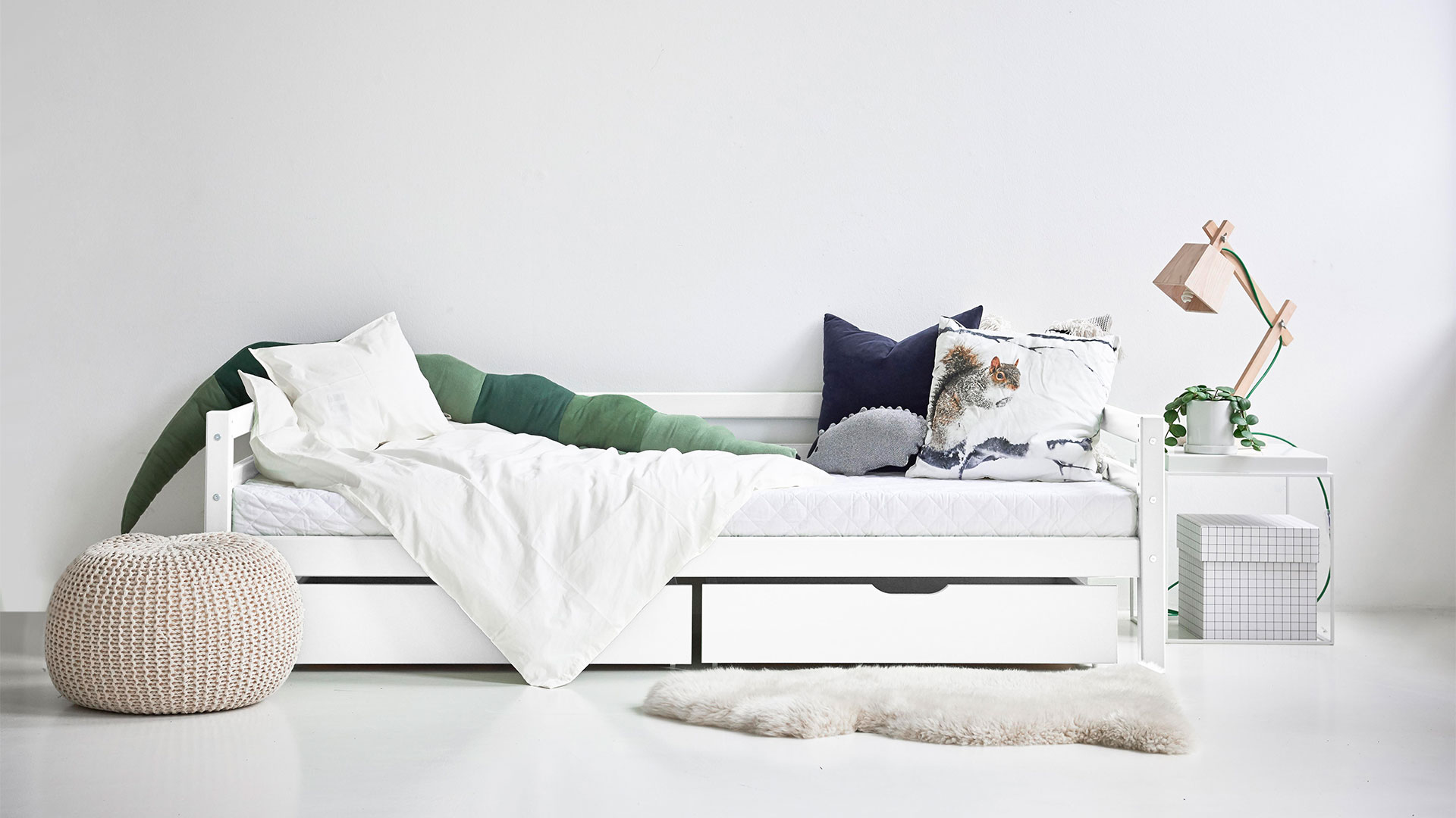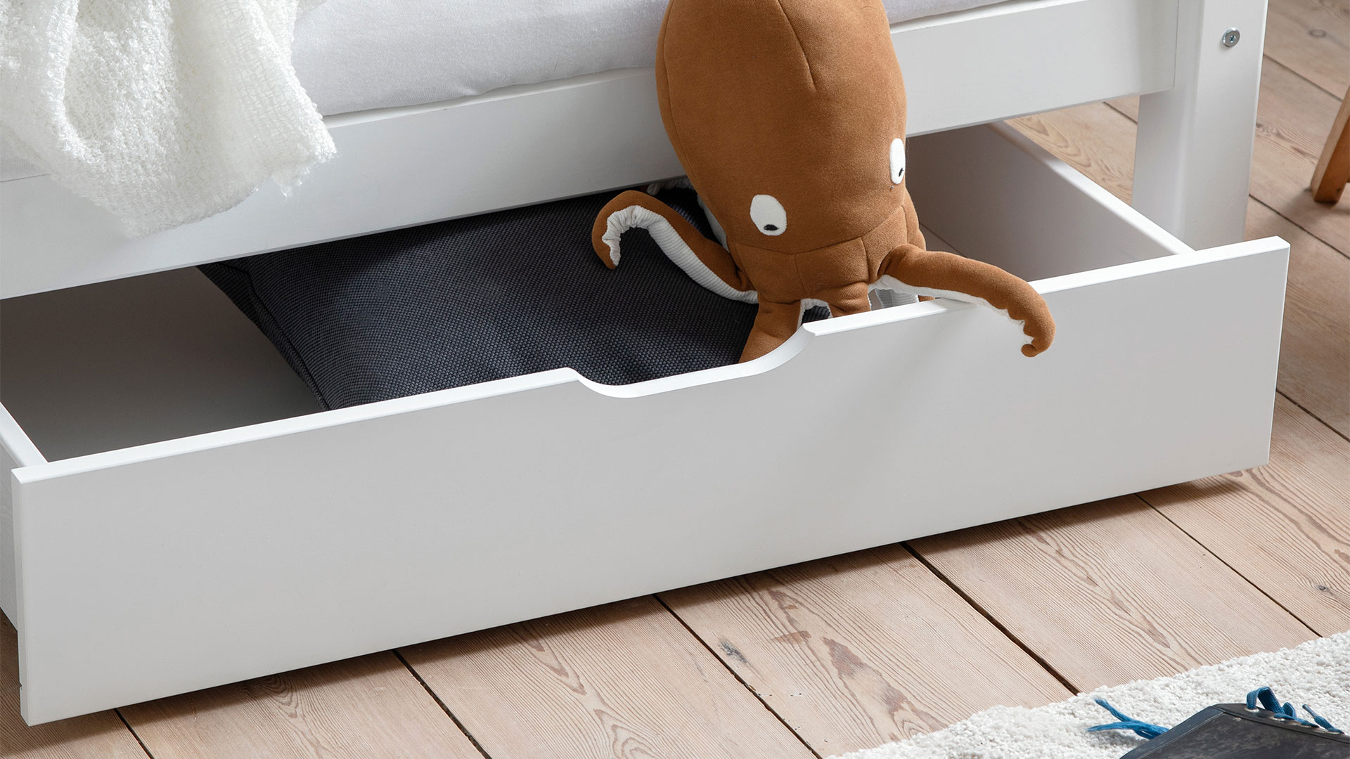 Tagsüber wird das Kinderbett mit ein paar Kissen im Handumdrehen zu einem gemütlichen Sofa, auf dem gelesen, geträumt oder gespielt werden kann - durch die stabile und sichere Bauweise ist das kein Problem. Wenn Sie den Platz unter dem Bett optimal nutzen möchten, sind die optionalen Schubkästen die ideale Lösung. Dank Griffmulden und leichtgängigen Rollen lassen sich Spielsachen, Kissen oder Decken kinderleicht verstauen.