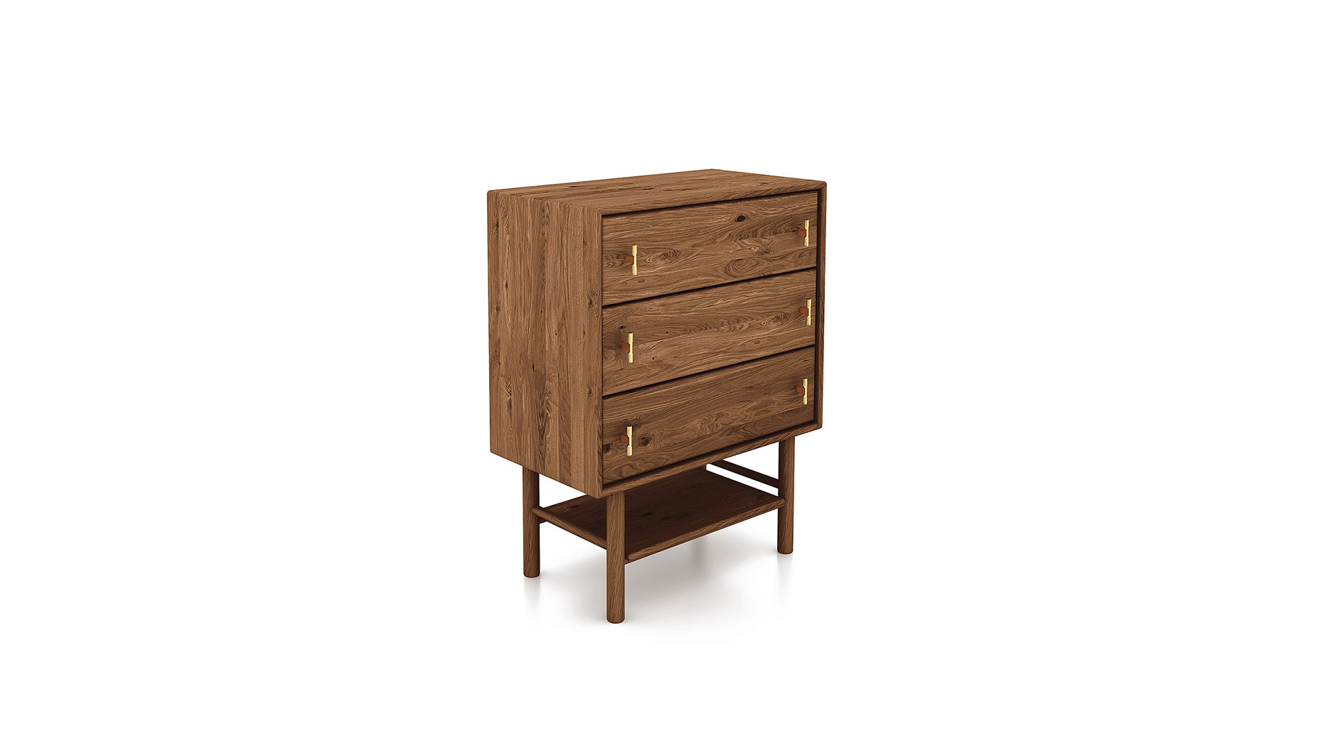 Diese außergewöhnliche Kommode bringt Klarheit und Natürlichkeit in Ihr Zuhause. Schlichte Linien, abgerundete Kanten und schlanke Beine erinnern an das Mid-Century-Design, während massives, geöltes Holz für eine warme Ausstrahlung sorgt. Ein besonderer Akzent sind die verspielten, goldfarbenen Griffe, die den reduzierten Look stilvoll auflockern. Die dunkel getönten Kommoden in Wildeiche Mokka setzt zusätzlich ein markantes, modernes Highlight.