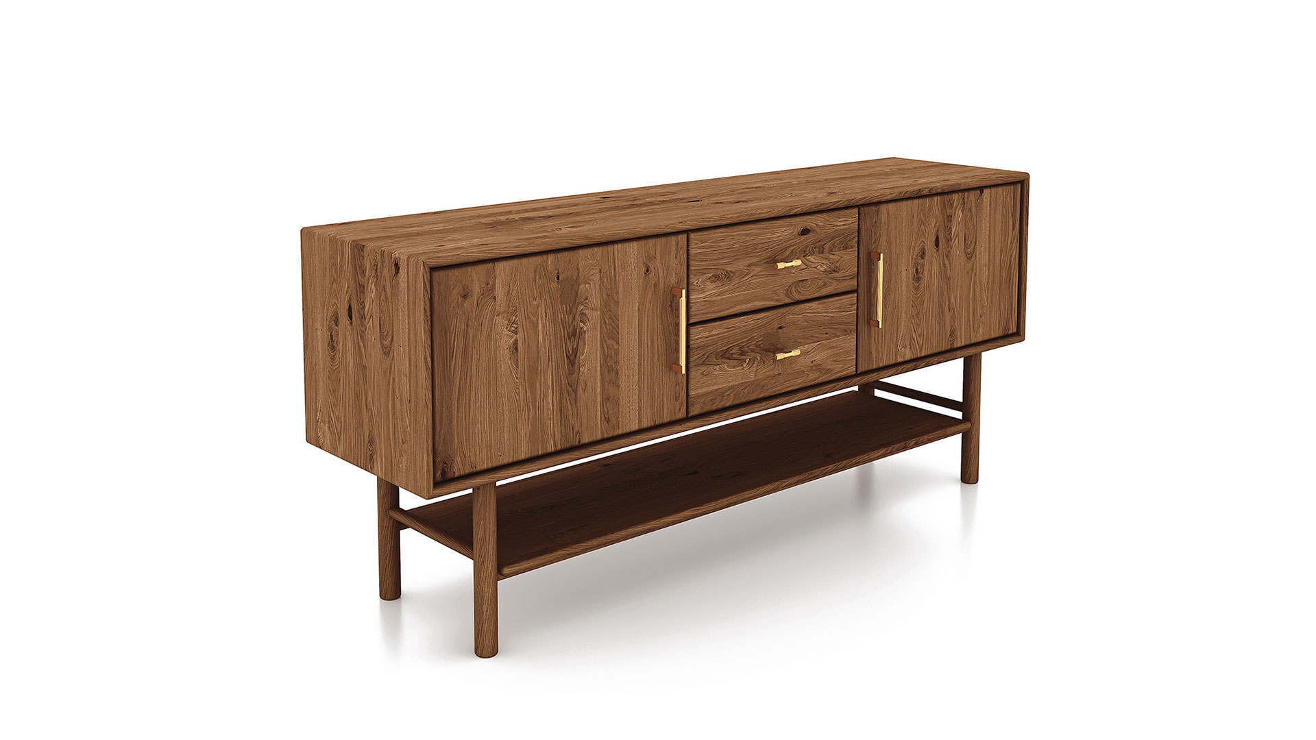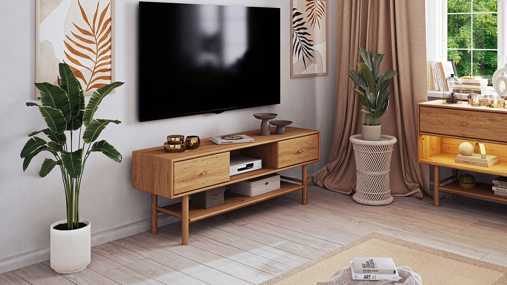 Stellen Sie sich vor, wie das Lowboard Serea Ihr Wohnzimmer mit zeitloser Eleganz erfüllt. Das Design im Mid-Century-Stil trifft auf warme Holzoberflächen und goldfarbene Griffe, die dem Möbelstück einen Hauch von Glamour verleihen. Ob in Kernbuche geölt, Wildeiche geölt oder Wildeiche mokka – jede Variante bringt ihre ganz eigene Ausstrahlung mit.