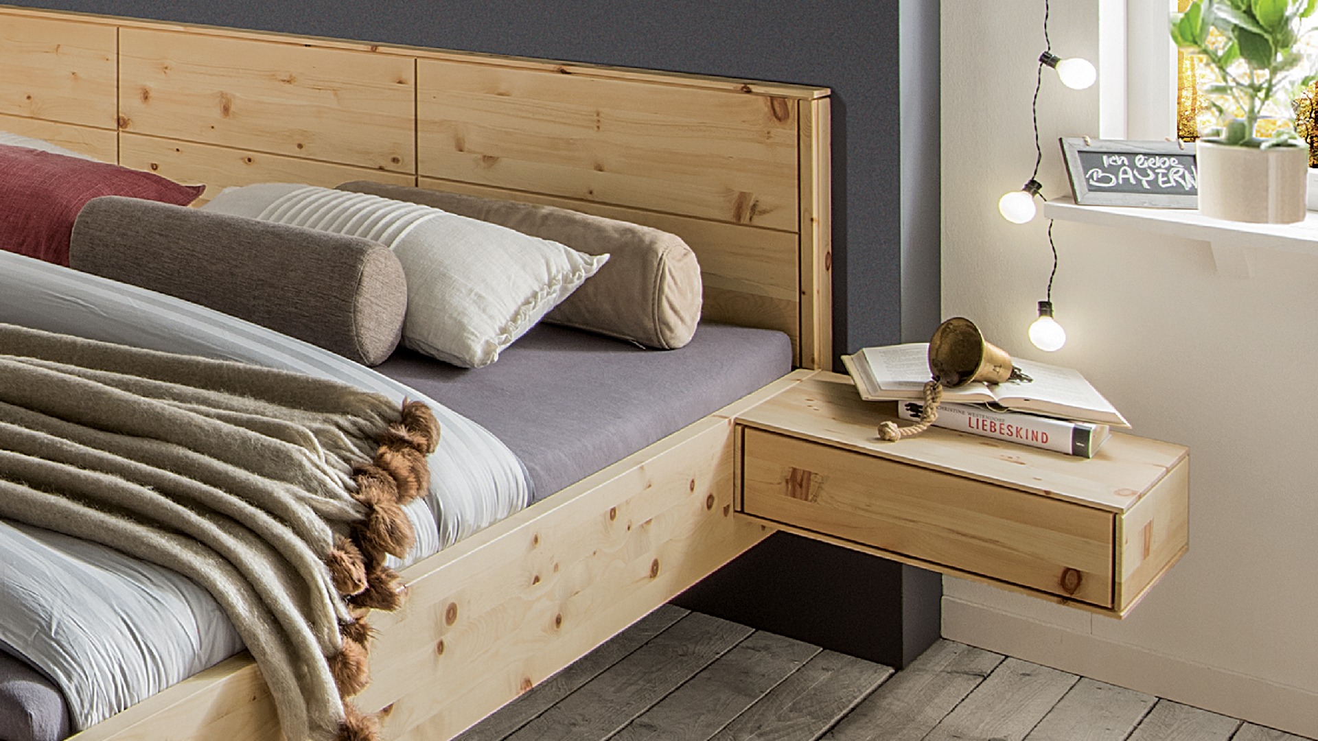 - schnörkelloser Schubladen-Nachttisch in Schwebeoptik, der die markante Zirbe perfekt in Szene setzt