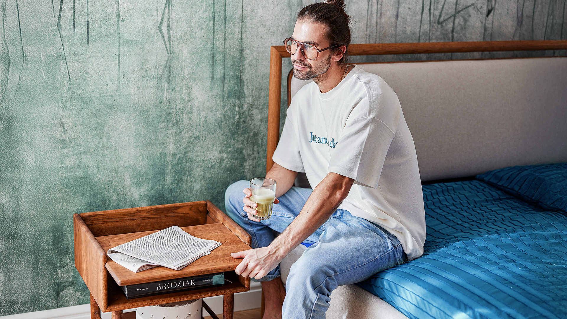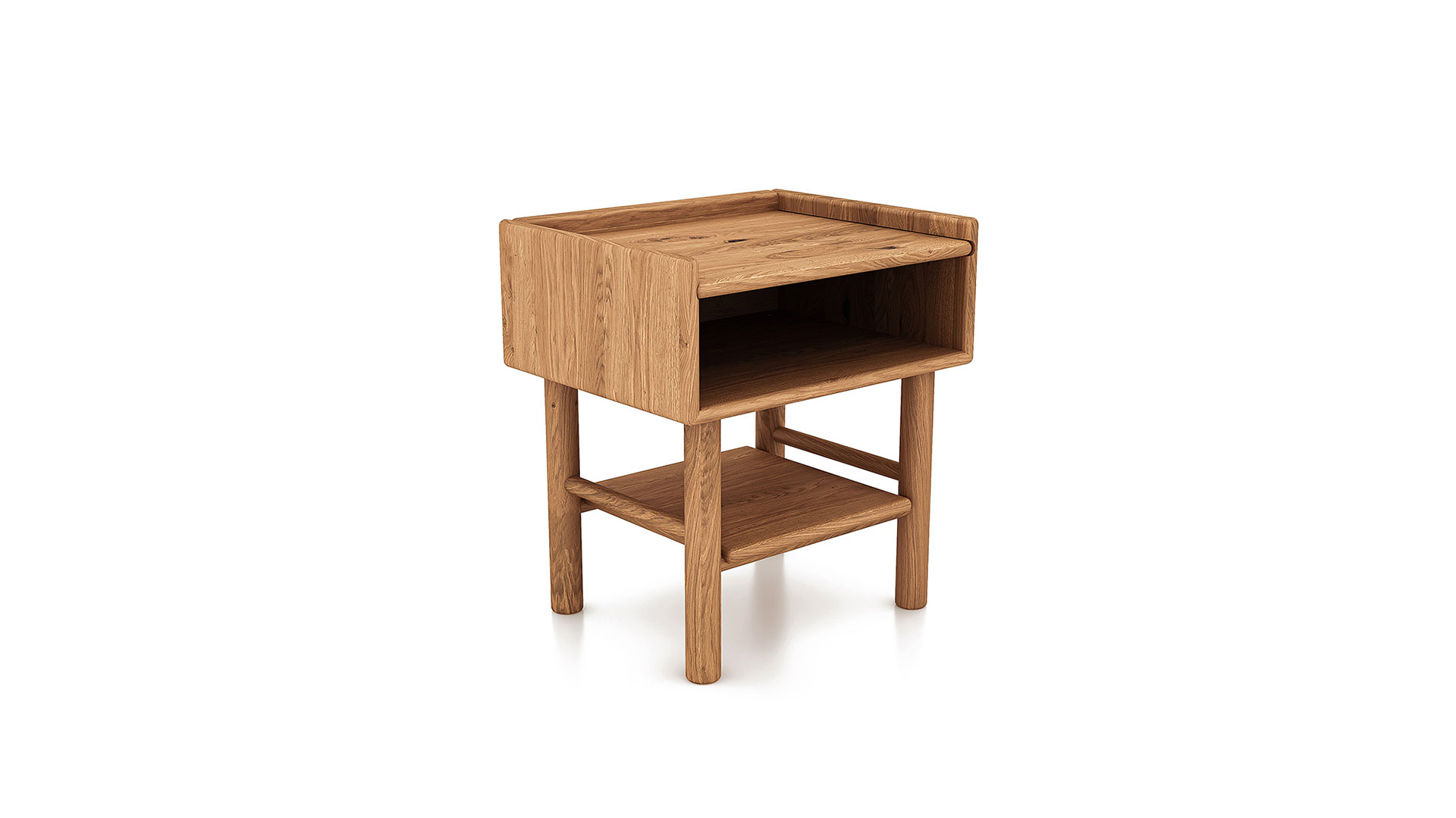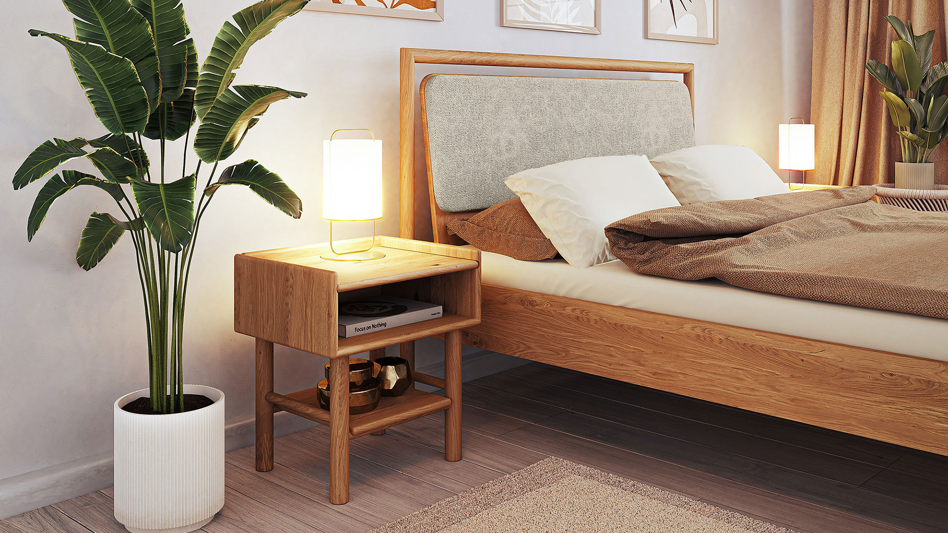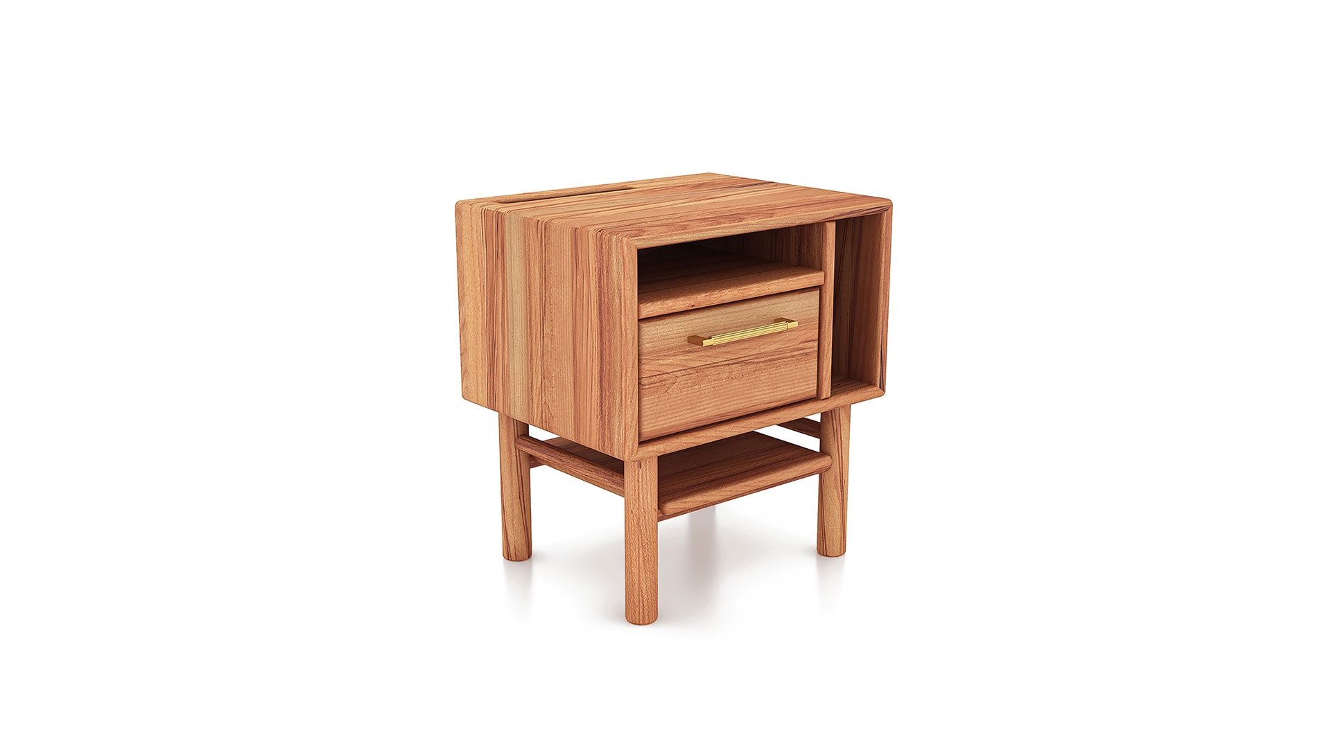 Serea" verleiht Ihrem Schlafzimmer den unverwechselbaren Charme des Mid-Century-Designs. Sanfte Linien, warme Holzoberflächen und ein goldfarbener Griff schaffen eine Atmosphäre, die Eleganz und Geborgenheit verbindet. Ob mit Schublade für persönliche Schätze oder mit offener Ablage – beide Varianten bieten mit dem zusätzlichen Zwischenboden Platz für alles, was Sie in Reichweite wissen möchten. Das Besondere an Variante 01: Die Ablage lässt sich komplett herausziehen. Einfach ideal als Tablett fürs kleine Frühstück im Bett oder als praktische Unterlage für Ihr Laptop.