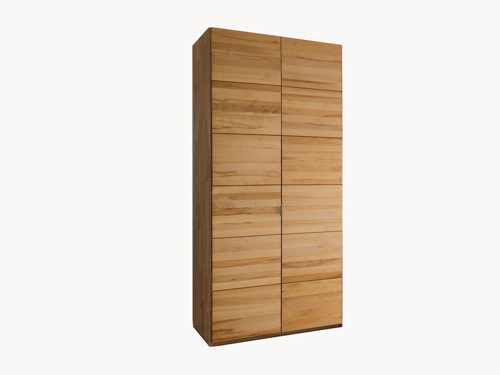 Es entsteht dieser faszinierende, kontrastreiche Kleiderschrank! Moderne Winkelgriffe aus Metall runden das Gesamtbild ab. Die äußeren Türen sind komplett aus Massivholz in Kassetten-Optik gearbeitet, in den inneren Türen ist jeweils eine Holzkassette eingearbeitet. So verläuft ein "Massivholz-Band" durch die gesamte Front und vereint die einzelnen Elemente zu einem harmonischen Ganzen. Beim Holz haben Sie die Wahl - wir bieten den Kleiderschrank in lebhaft eleganter Kernbuche oder edel rustikaler Wildeiche an.