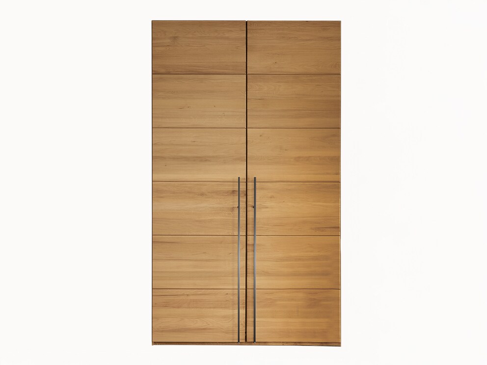 ... Die schöne Kassettenstruktur der edlen, stabverleimten Türen entsteht durch elegante, sorgfältig eingearbeitete Querfugen. Ein absoluter Blickfang sind die langen Relinggriffe aus Metall, die im unteren Teil der Schranktüren angebracht sind. "Moderna" wird aus massivem Kernbuchen- oder Wildeichenholz gefertigt. Wählen Sie aus 10 Schrankbreiten von schlanken 96 cm bis stolzen 359 cm. Wenn Sie sich für die pfiffige Höhe 235 cm entscheiden, nutzen Sie sogar den Raum bis zur Decke optimal. Mit dem vielseitigen Zubehör und dem optionalen Passepartoutrahmen wird die Schrank-Gestaltung zur reinen Freude.