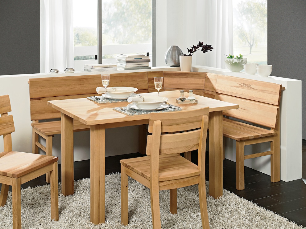 Eckbank Comera sorgt für viel Platz und Gemütlichkeit, hier in lebhafter Kernbuche