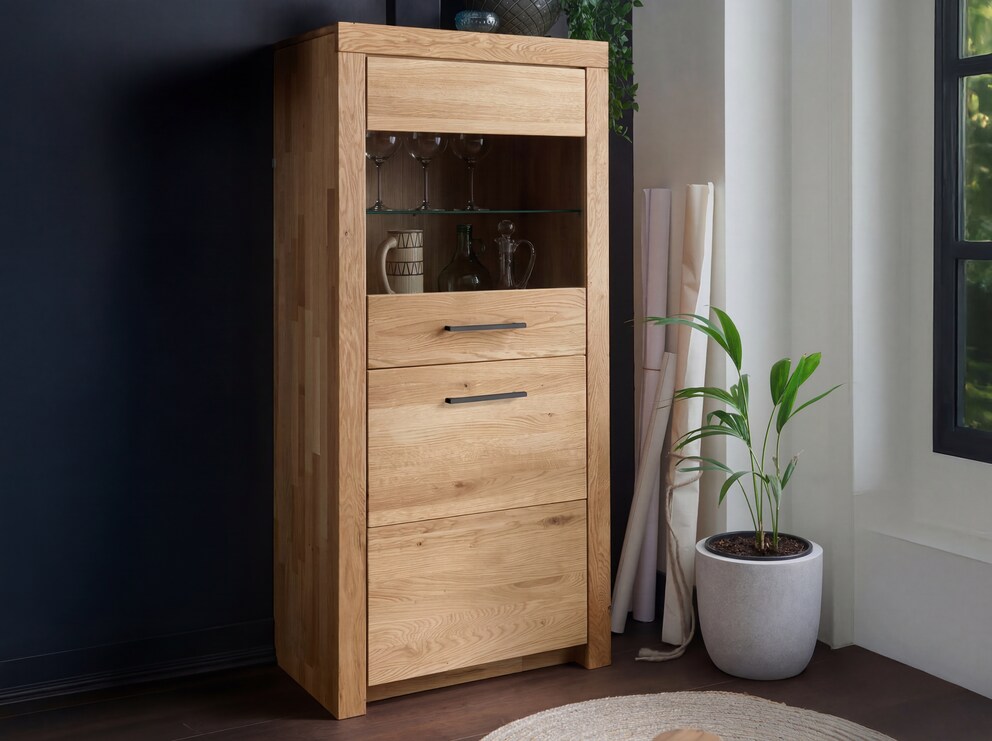 Zeitloses und geradliniges Highboard aus edlem Wildeichenholz mit markantem Rahmen