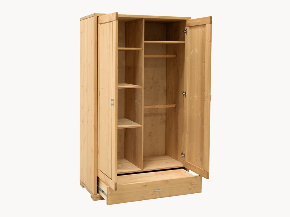 Der stilvolle Kleiderschrank "Piccolino" mit seinen hochwertigen Kassettentüren ist in 2 Varianten erhältlich. Das 2-türige Modell mit großer Schublade bietet Ihnen als Inneneinteilung hinter der linken Tür 3 Einlegeböden, hinter der rechten Tür befindet sich 1 Einlegeboden und 2 Kleiderstangen. Der 3-türige Kleiderschrank mit zwei Schubladen ist mit 1 kurzen und 1 langen Schublade ausgestattet. Die Inneneinteilung besteht aus 3 langen Einlegeböden hinter den beiden linken Türen, 1 kurzen Einlegeboden und 2 kurzen Kleiderstangen hinter der rechten Tür. Die leichtgängigen Schubladen verfügen jeweils über einen praktischen Vollauszug.