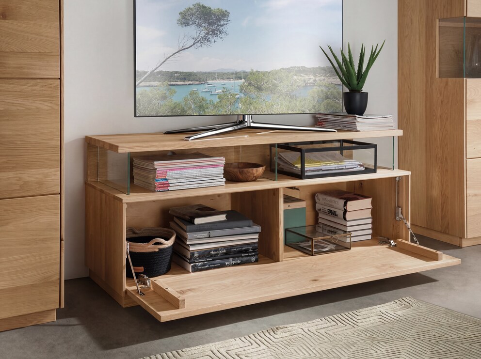 Die großzügige Deckplatte bietet viel Stellfläche für Ihre Elektronik. Die geräumigen, verglasten Gerätefächer haben selbstverständlich einen Kabelauslass in der attraktiven, aufwändig sandgestrahlten Struktur-Rückwand. Und damit haben Sie nie mehr Kabelsalat! Hinter der großen Klappe lässt sich allerhand Nützliches verräumen. Variante 02 bietet zusätzlich noch ein Schrankfach an der rechten Seite.