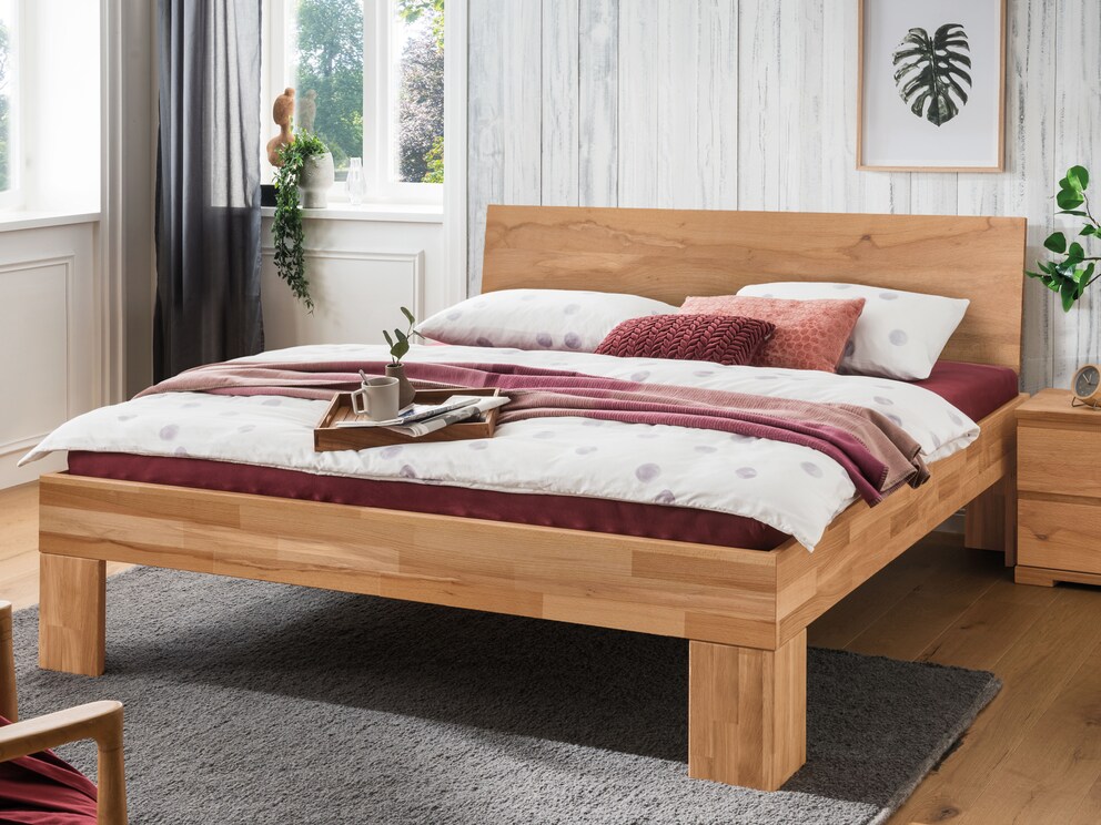 ... wird Massivholzbett "Cepo" Sie in seinen Bann ziehen. Freuen Sie sich auf Ihr neues Bett in lebhafter Kernbuche oder edler Wildeiche. Die Eckverbindungen des breiten Rahmens sind aufwändig attraktiv auf Gehrung gearbeitet. Stabverleimte Holzwinkel bilden die Füße und wecken raffiniert den Eindruck massiver Bettfüße.