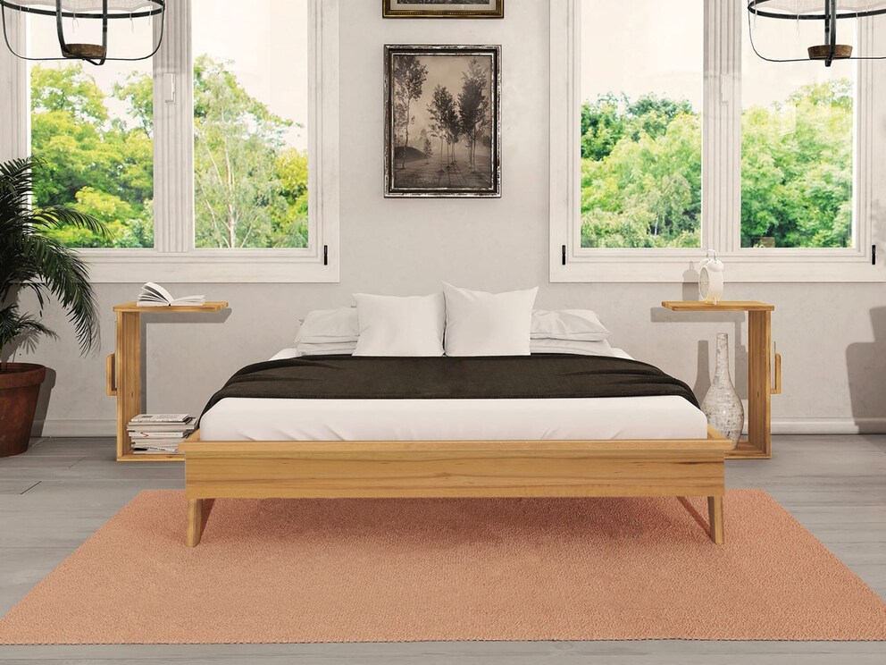 Liebevolle Details wie die schräg an den Bettrahmen angesetzten Bettfüße und der oben mit einer breiten Abschlussleiste versehene Bettrahmen bewirken diesen Effekt.