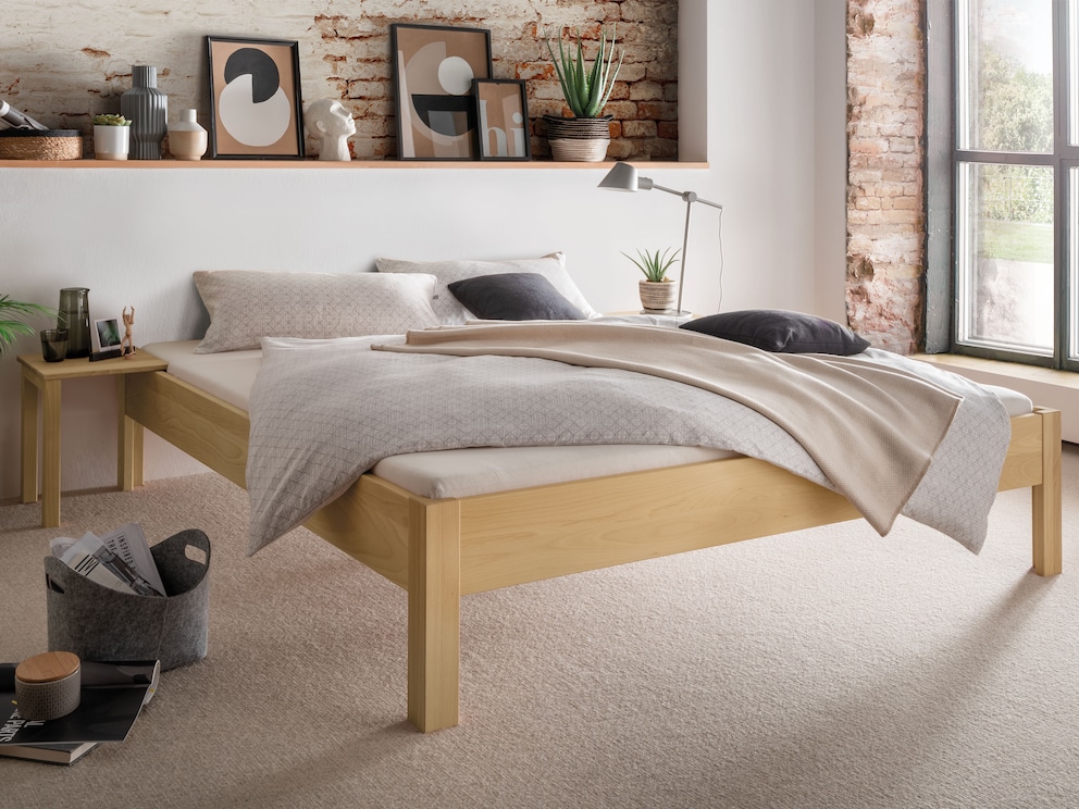 Massivholzbett Recodo überzeugt mit seiner reduziert klaren Form, hier in Buche