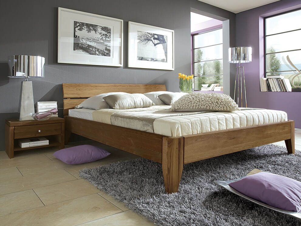 Die dunkle Maserung der Kernbuche setzt schöne Kontraste zu dem leicht rötlich-hellbraunen Grundton des Holzes. Während das wohnliche Kiefernholz durch Äste und Jahresringe eine belebte Oberfläche erhält, strahlt das Eichenholz Ruhe und Wärme aus. Spezialisten auf dem Gebiet der Verarbeitung von Massivholz fertigen dieses Bett und verleihen ihm durch die sorgfältige Auswahl der Hölzer einen ganz besonderen Charakter.