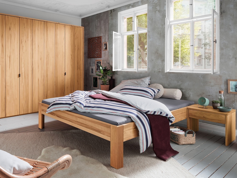 2 gemütlich geneigte Kopfteil-Varianten aus Holz und ein bequem gepolstertes Stoff-Kopfteil in 2 Farben harmonieren perfekt zum eleganten Rahmen. Das schöne Bett ist aber auch ohne Kopfteil als Liege erhältlich - beispielsweise ideal unter einer Dachschräge. Noch ein Tipp für große Menschen: Massivholzbett "Svariata" ist auch in 220 cm Länge