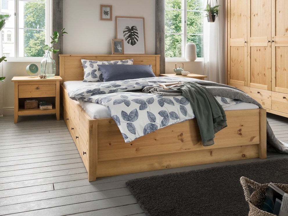 Das großflächige Kopfteil wird durch den umlaufenden Rahmen gekonnt in Szene gesetzt. Der wenig ausladende Bettrahmen macht "Tusa" auch ideal für das kleinere Schlafzimmer. Sie finden ein Bett mit weißer Oberfläche interessanter? Dieses Massivholzbett erhalten Sie wahlweise gelaugt/geölt oder weiß-gewachst. Immer noch nicht überzeugt? Mit separat erhältlichen Schubkästen wird der ungenutzte Platz unter dem Bett zu wertvollem Stauraum.