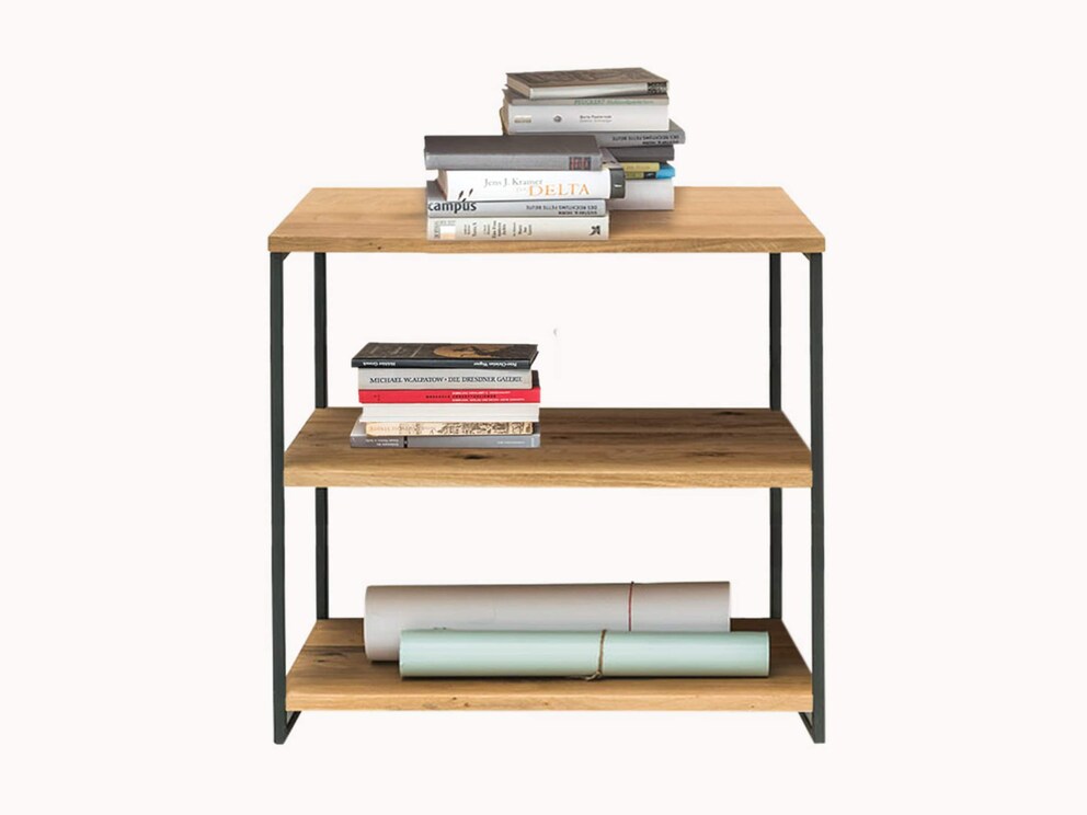 Markantes Wildeichenholz trifft auf kühlen Schwarzstahl. Dieser spannende Kontrast bestimmt den modernen Charakter der geradlinigen Regale im Industriestil. Auf Seitenteile oder eine Rückwand wurde verzichtet, die Fachböden, sowie die Schubladen- und Schrankelemente sind von außen befestigt und scheinen fast im Rahmen zu schweben. Damit erhalten die Regale eine offene, leichte Optik.