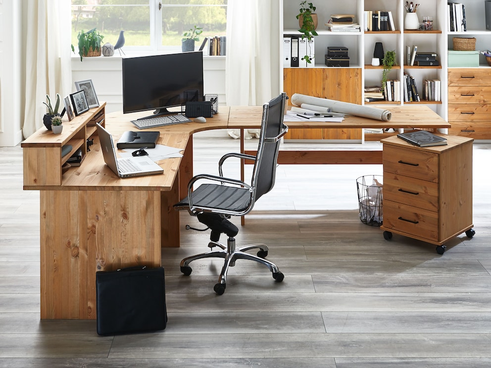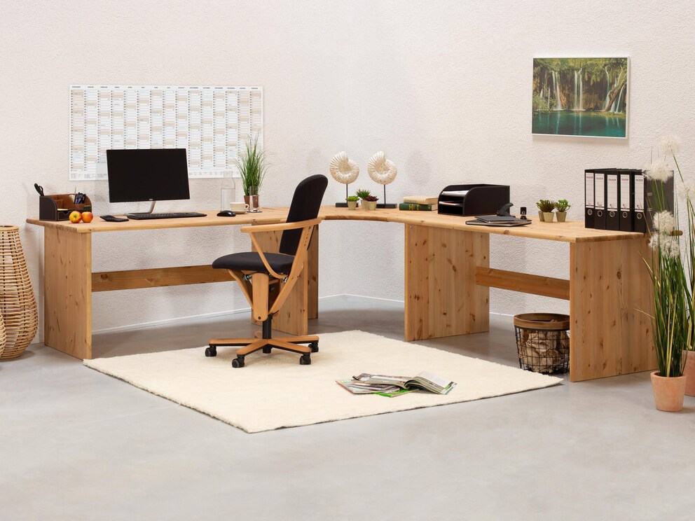 Es stehen Ihnen 2 Schreibtische mit verschiedenen Tischbreiten als Basis zur Verfügung, die mittels Eckplatte oder Ecktisch zu interessanten Arbeitsplatz-Lösungen zusammengefügt werden können. Wenn Sie viel Platz benötigen und etwa Arbeiten verschiedener Art voneinander trennen möchten, können Sie in Ihrem Arbeitszimmer beispielsweise eine wahre "Arbeitsinsel" um sich herum schaffen. So können Sie mit Ihrem Bürostuhl überall bequem agieren.