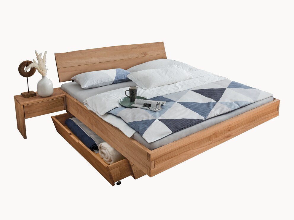Diese praktischen Schubkästen verschaffen Ihnen zusätzlichen Stauraum. Sie sind damit die perfekte Ergänzung zu den unten aufgeführten Schwebebetten. Der Schubkasten verjüngt sich nach unten und folgt damit der Linie der Fußelemente dieser Bettmodelle. Passend zu den Betten sind auch die Schubkästen in Kernbuche oder Wildeiche erhältlich. Ab 160 cm Bettbreiten können Sie ganz nach Ihrem Bedarf auch 2 Schubkästen einschieben.