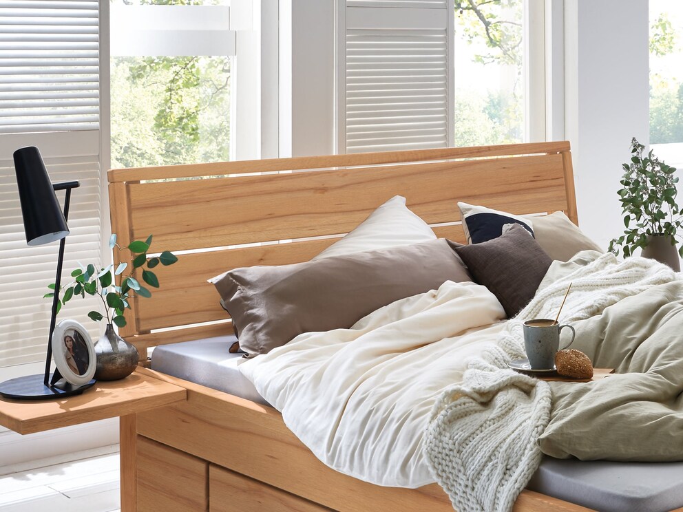 Das edle Schubkastenbett schafft eine heimelige Atmosphäre, wie sie nur von Massivholz ausgehen kann. Es verbindet zeitloses Design mit individueller Ausstrahlung. In Kernbuche sorgt das Bett durch die gleichmäßige und dunkle Maserung für eine warme und elegante Atmosphäre. Im Gegensatz dazu verleiht der ruhige Charakter des schönen Eichenholzes Ihrem Schlafzimmer eine angenehm warme Stimmung. Gehen Sie zu Bett, kommen Sie zur Ruhe und genießen Sie es, Ihre Seele baumeln zu lassen.