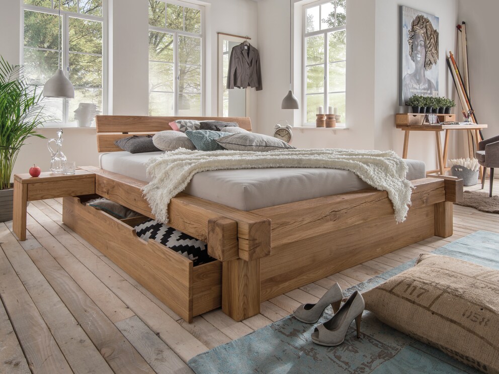 Die einzigartige Maserung der edlen Wildeiche macht dieses massive Schubkastenbett zu einem unvergleichlichen Blickfang in Ihrem Schlafzimmer. "Viga" hält noch ein weiteres, spannendes Detail für Sie bereit ...
