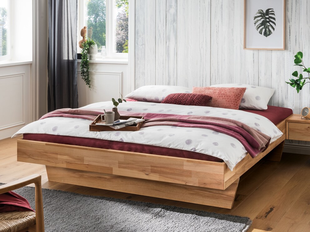 Bei Schwebebett "Vivaro" wurde ganz bewusst mit den Verarbeitungstechniken von Massivholz gespielt. Die Fußelemente und die Holz-Kopfteile sind stabverleimt. Die durchlaufende Maserung strahlt Ruhe und Ebenmäßigkeit aus. Also die perfekte Bühne ...