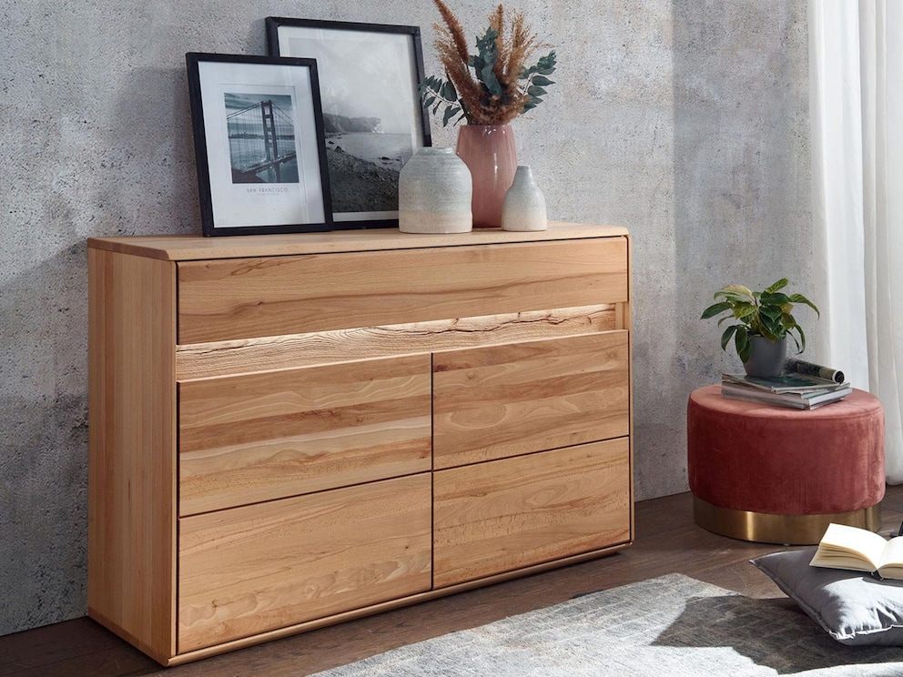 Dieses Möbelprogramm hält noch ein attraktives Highlight für Sie bereit. Sichtbare Rückwände und etwaige Applikationen sind aus gebürstetem Massivholz. Hier wird das Holz mit einer Bürste in Faserrichtung bearbeitet. Weiche Holzteile werden dabei sanft abgetragen und nur die härtere Maserung bleibt übrig. So entsteht eine plastische Oberfläche, die besonders natürlich wirkt und Ihnen eine einzigartige Haptik beschert. Je nach Ausführung erhalten Sie Ihr neues Sideboard mit einer oder zwei Schubladen und zwei oder drei geräumigen Fächern hinter attraktiv gestalteten Türen aus Massivholz. Die komfortable Softclose-Dämpfung sorgt für geräuscharmes Schließen. Das lebhafte Kernbuchen- oder edle Wildeichenholz bringt natürlichen Charme in Ihr Zuhause. Verwirklichen Sie mit Programm "Bassano" Ihren ganz persönlichen Wohntraum.