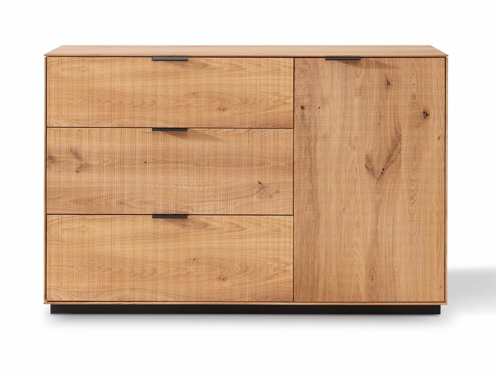 Sideboard "Eterna" aus massivem Wildeichenholz vereint natürliche Schönheit mit zeitloser Eleganz. Die markant raue Holzstruktur der Tür- und Schubladenblenden verleiht eine einzigartige Ausstrahlung. Farbliche Akzente können Sie mit einer Schubladenblende in Anthrazitglas oder Weißglas setzen. Wenn Sie einen einheitlichen Look bevorzugen, ist eine Holzblende die richtige Wahl