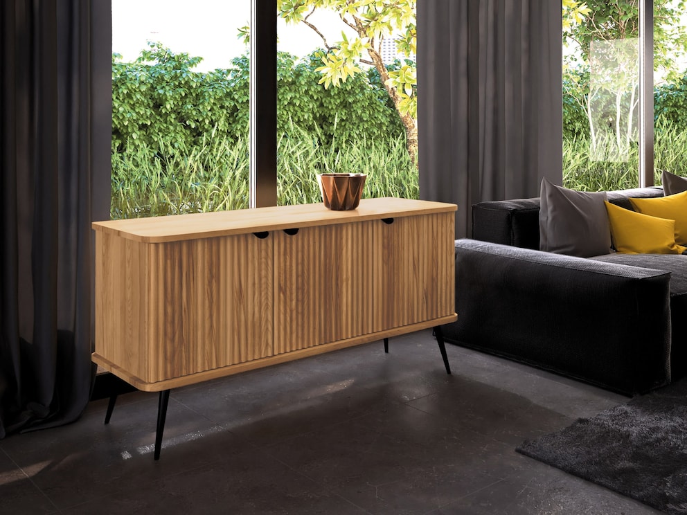 In den großzügigen Schrankfächern und Schubladen finden Ihre Schätze genügend Platz und werden vor Staub geschützt. Die dezenten Griffe aus schwarzem Metall passen perfekt zu der abgerundeten Formgebung des Sideboards und schaffen in Verbindung mit dem Holz einen interessanten Material-Mix. Durch die schräg zulaufenden Füße wirkt das Möbelstück optisch leicht.