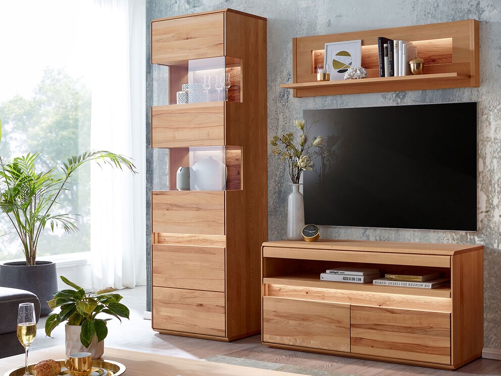 ... gelingt mit der modernen Vitrine "Bassano" besonders gut. Die Applikation aus gebürstetem Massivholz wird durch die im Lieferumfang enthaltene Beleuchtung stilvoll beleuchtet. Dieses Möbelprogramm hält allerdings noch ein ganz besonderes Design-Highlight für Sie bereit.
