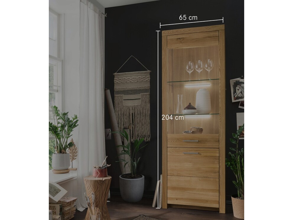 Dann ist die optionale Beleuchtung genau das Richtige für Sie! Gläser, liebgewonnene Mitbringsel oder die Eintrittskarte vom Lieblingskonzert finden hier ihr angemessenes Ambiente. Doch damit nicht genug - hinter den massiven Holztüren findet sich viel praktischer Stauraum.