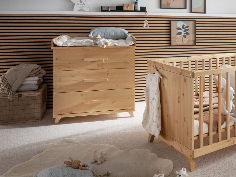 Dann passt "Lunda" perfekt in Ihr Heim! Sie präsentiert sich entweder in frischem Weiß mit raffinierten Akzenten durch gelaugte Oberfläche - Wickelaufsatz, Abschlussleisten, Füße und Griffe. Oder Sie wählen die komplett gelaugte Variante als noch natürlicheren Hingucker im Babyzimmer.