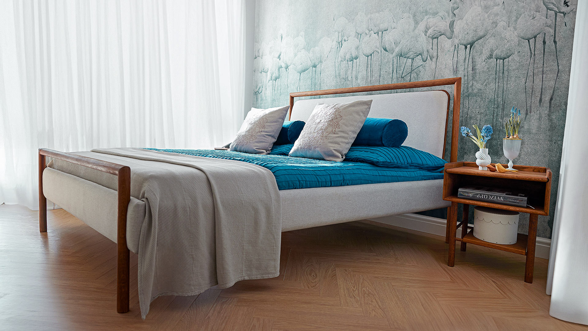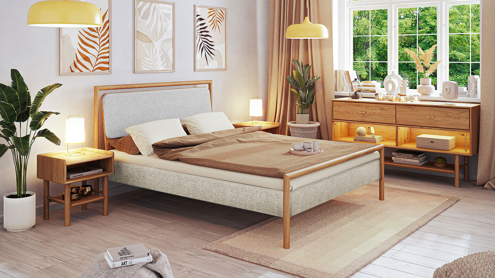 Das Polsterbett "Serea" verbindet klassisches Mid-Century-Design mit wohnlicher Sanftheit. Massives Holz in Kernbuche, Wildeiche oder Wildeiche mokka rahmt das elegante Bettgestell ein, während der Bezug aus natürlichem Leinen für Leichtigkeit und Wärme sorgt. So entsteht ein Möbelstück, das Stil und Behaglichkeit harmonisch vereint.