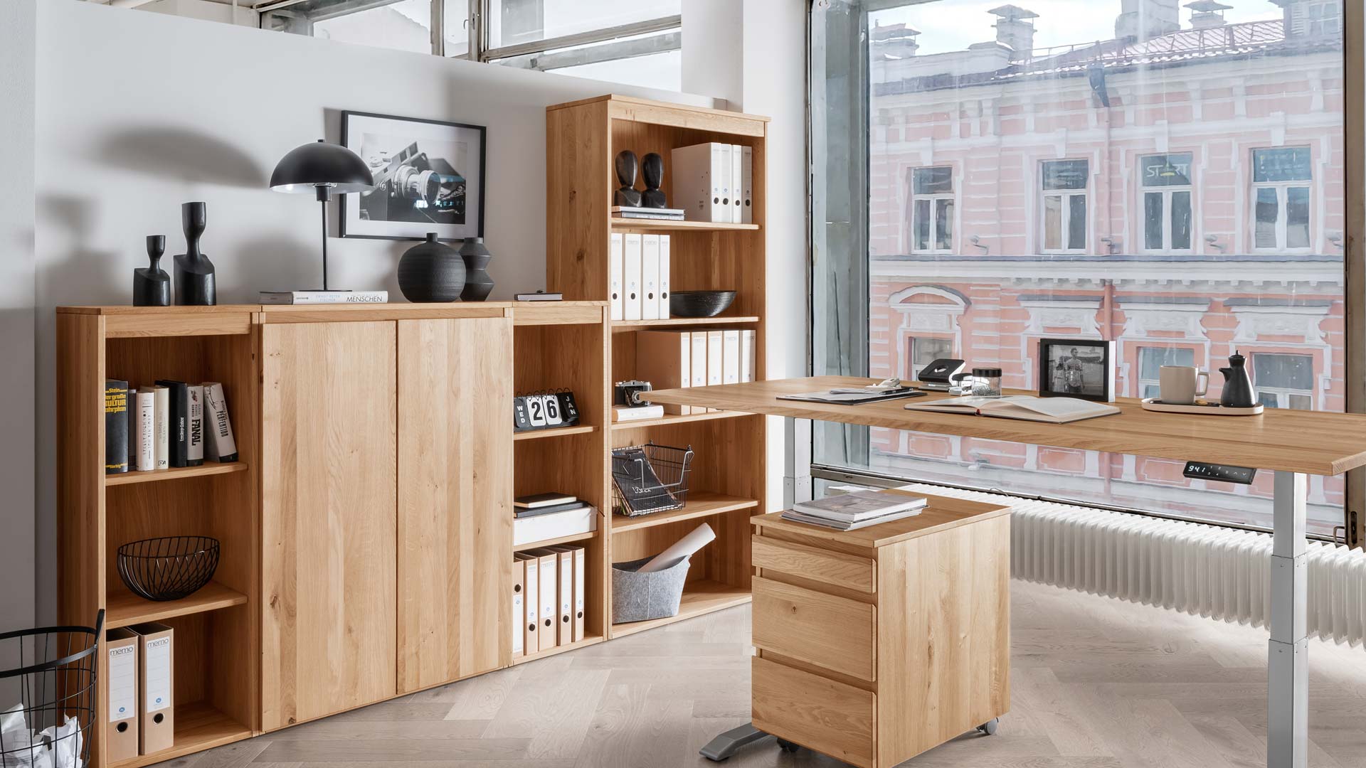 Dieses Aktenregal bringt Ruhe, Struktur und echte Natur ins Büro. Massive Wildeiche strahlt Wärme aus und zeigt ihre lebendige Maserung auch an der sichtbaren Rückwand. Höhenverstellbare Fachböden passen sich flexibel an Ordner, Bücher und Lieblingsstücke an. Ob schlank, kompakt oder großzügig – drei Versionen bieten die passende Lösung für jeden Raum. Ein nachhaltiges Möbelstück, das Ordnung schafft und Wertigkeit spürbar macht.