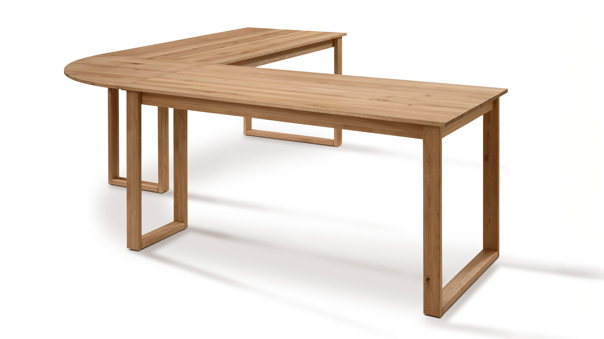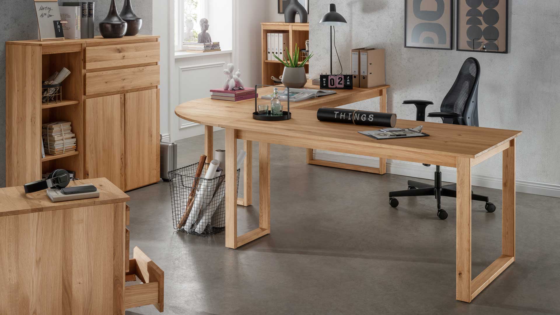 Dieser Schreibtisch schafft eine ruhige Basis für konzentriertes Arbeiten. Massive Wildeiche mit lebendiger Maserung bringt natürliche Wärme ins Büro und sorgt für eine angenehme Atmosphäre. Vier Größen von 100 bis 160 cm Breite bieten die passende Lösung für unterschiedliche Raumkonzepte. Mit dem optionalen Eckelement lassen sich mehrere Tische flexibel verbinden. In Deutschland gefertigt und hochwertig verarbeitet – für langlebige Qualität und modernes Ambiente.
