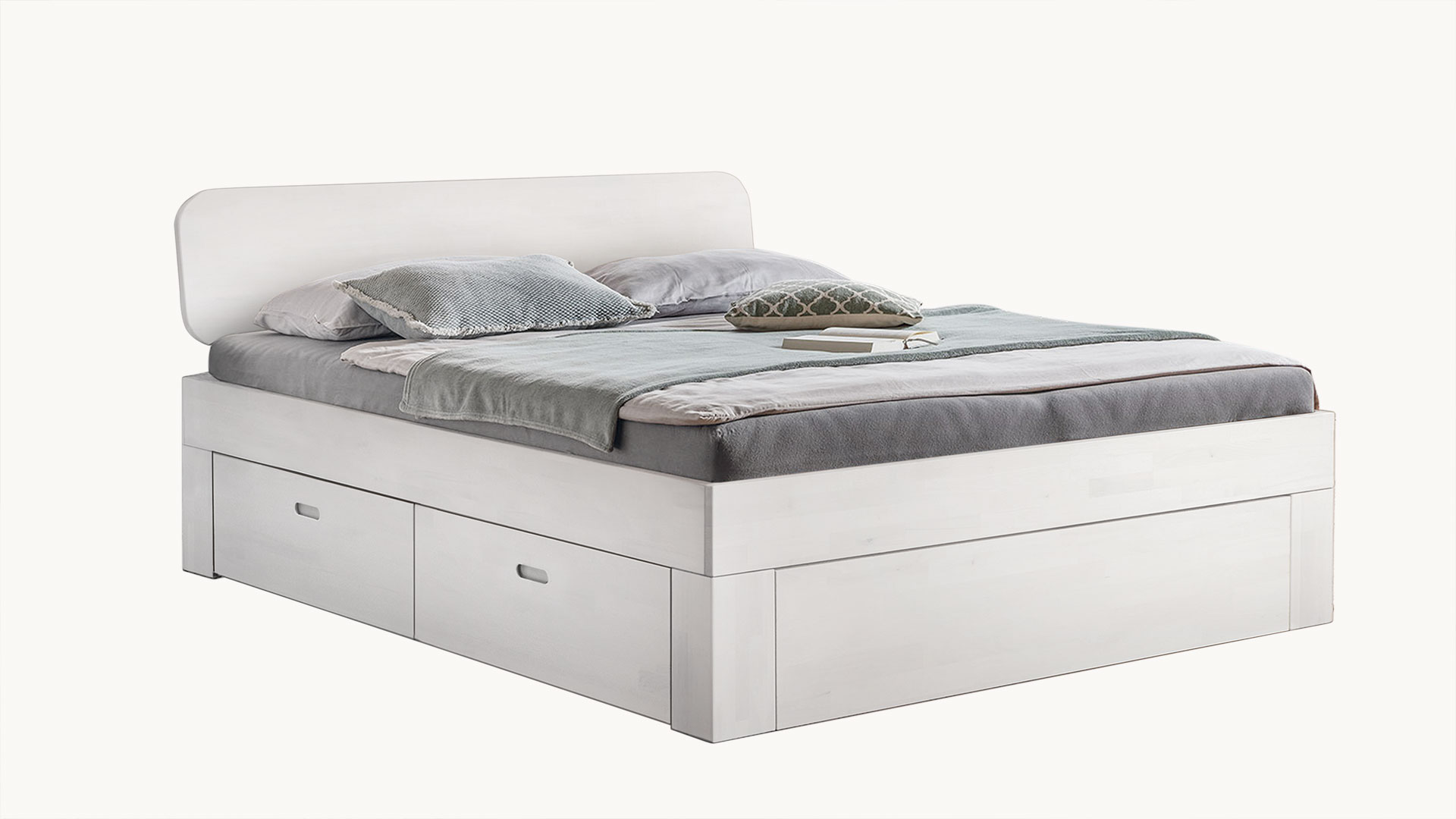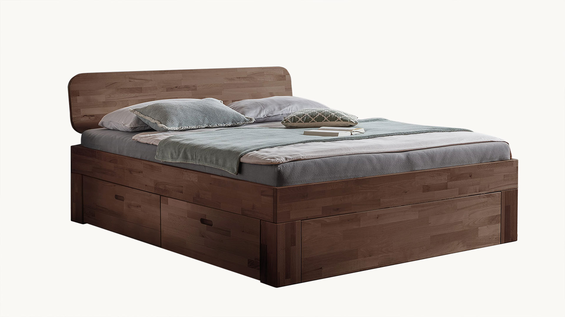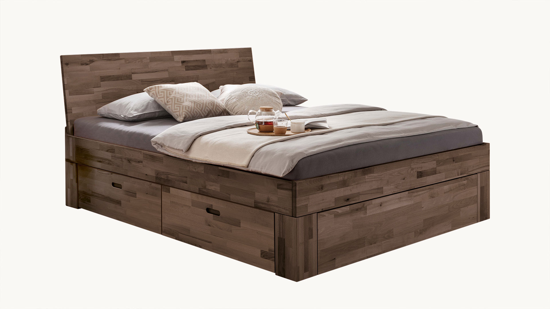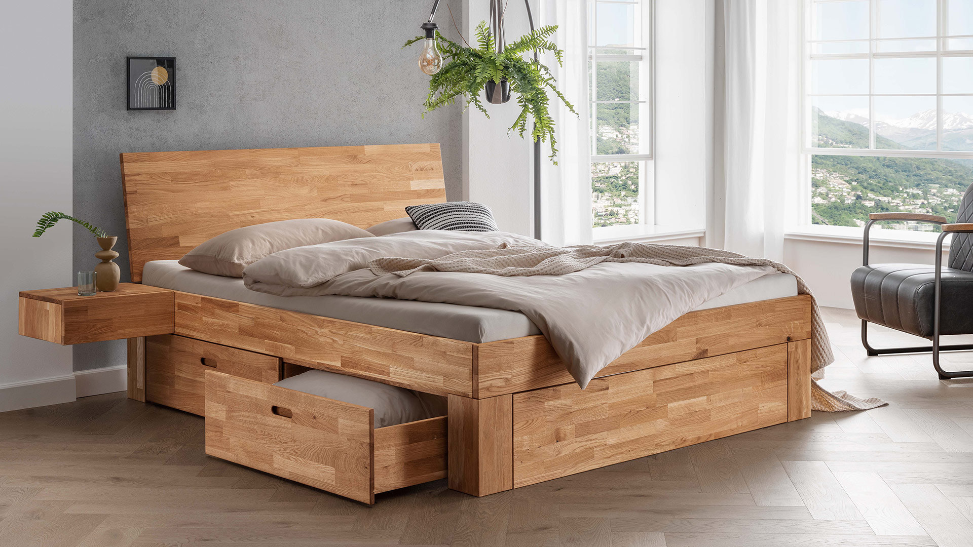 Damit das Schubkastenbett optimal zu Ihnen passt, stehen Ihnen zwei edle Holzkopfteile zur Auswahl. Auch bei den Holzarten können Sie sich für Ihren Favoriten entscheiden. Die massive Kernbuche überzeugt mit natürlicher, lebendiger Maserung, während Wildeiche durch ihre markante, zeitlose Ausstrahlung besticht. Tolle Farbakzente setzen Sie mit dem Buchenholz in dunkler Mokka-Farbe, während in Buche weiß-lasiert das Bett eine leichte und moderne Note mit sich bringt. Schubkastenbett "Lunara" vereint ein zeitloses Design mit praktischem Stauraum und passt mühelos in jedes Schlafzimmer.