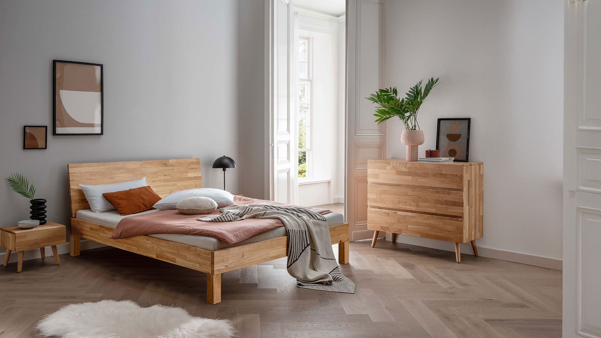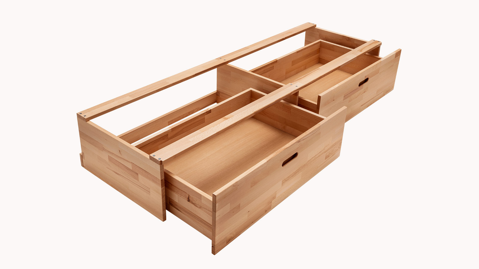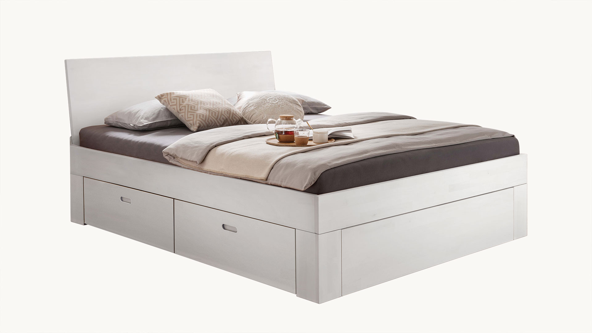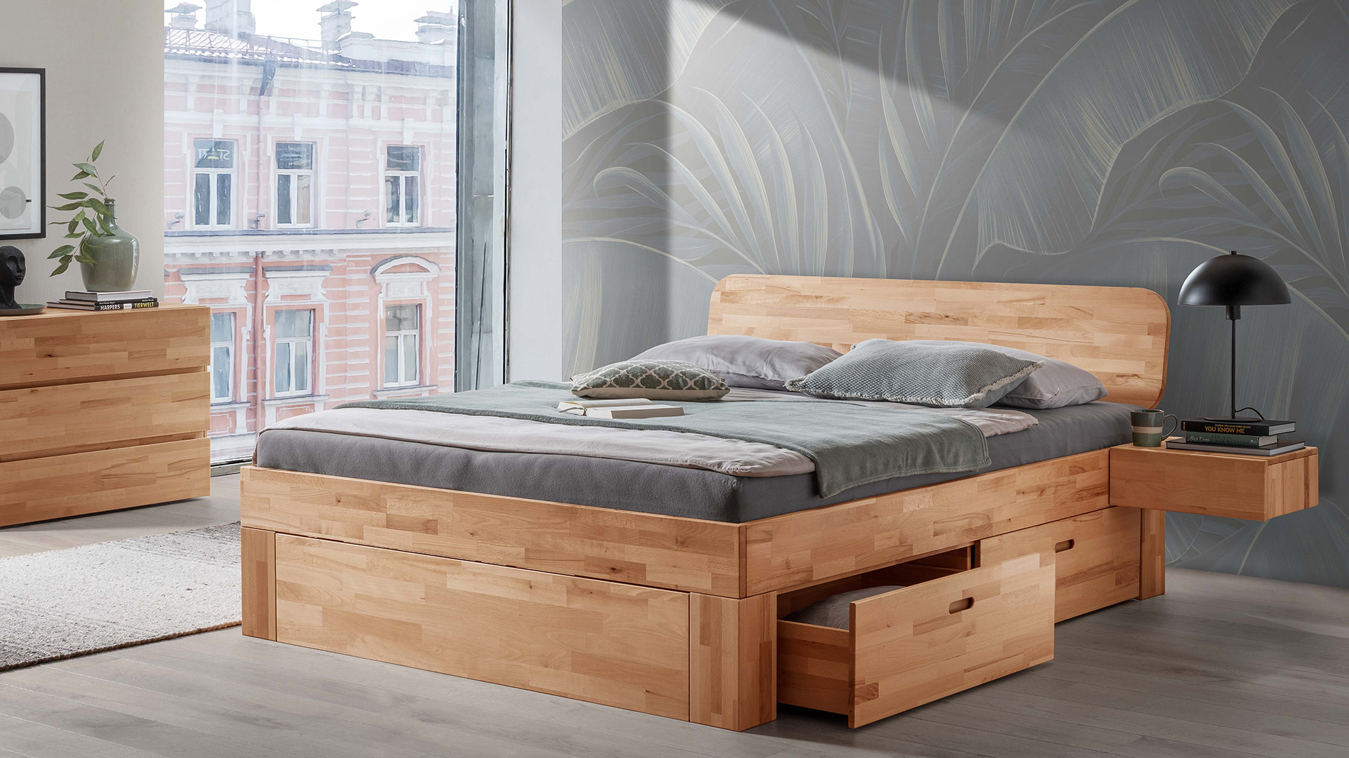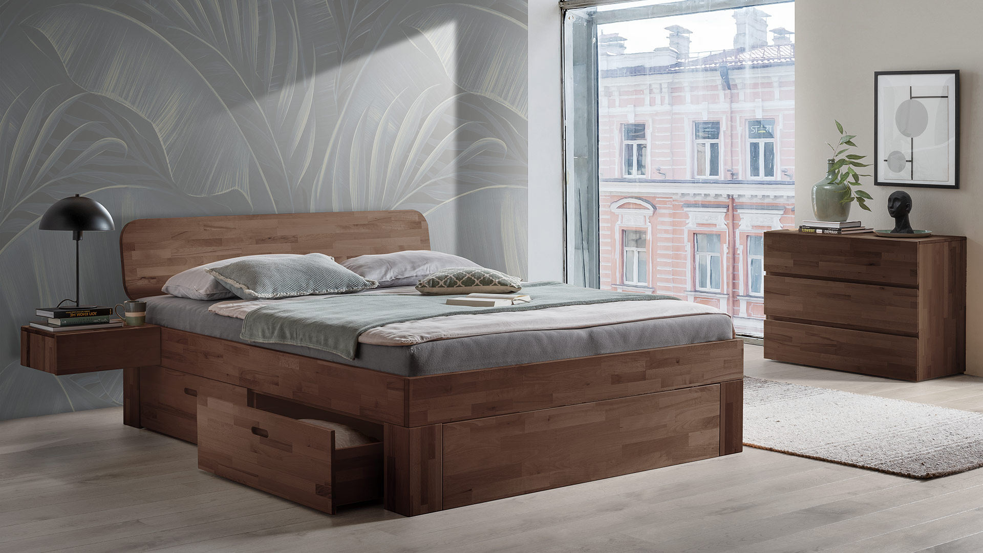 Damit das Schubkastenbett optimal zu Ihnen passt, stehen Ihnen zwei edle Holzkopfteile zur Auswahl. Auch bei den Holzarten können Sie sich für Ihren Favoriten entscheiden. Die massive Kernbuche überzeugt mit natürlicher, lebendiger Maserung, während Wildeiche durch ihre markante, zeitlose Ausstrahlung besticht. Tolle Farbakzente setzen Sie mit dem Buchenholz in dunkler Mokka-Farbe, während in Buche weiß-lasiert das Bett eine leichte und moderne Note mit sich bringt. Schubkastenbett "Lunara" vereint ein zeitloses Design mit praktischem Stauraum und passt mühelos in jedes Schlafzimmer.