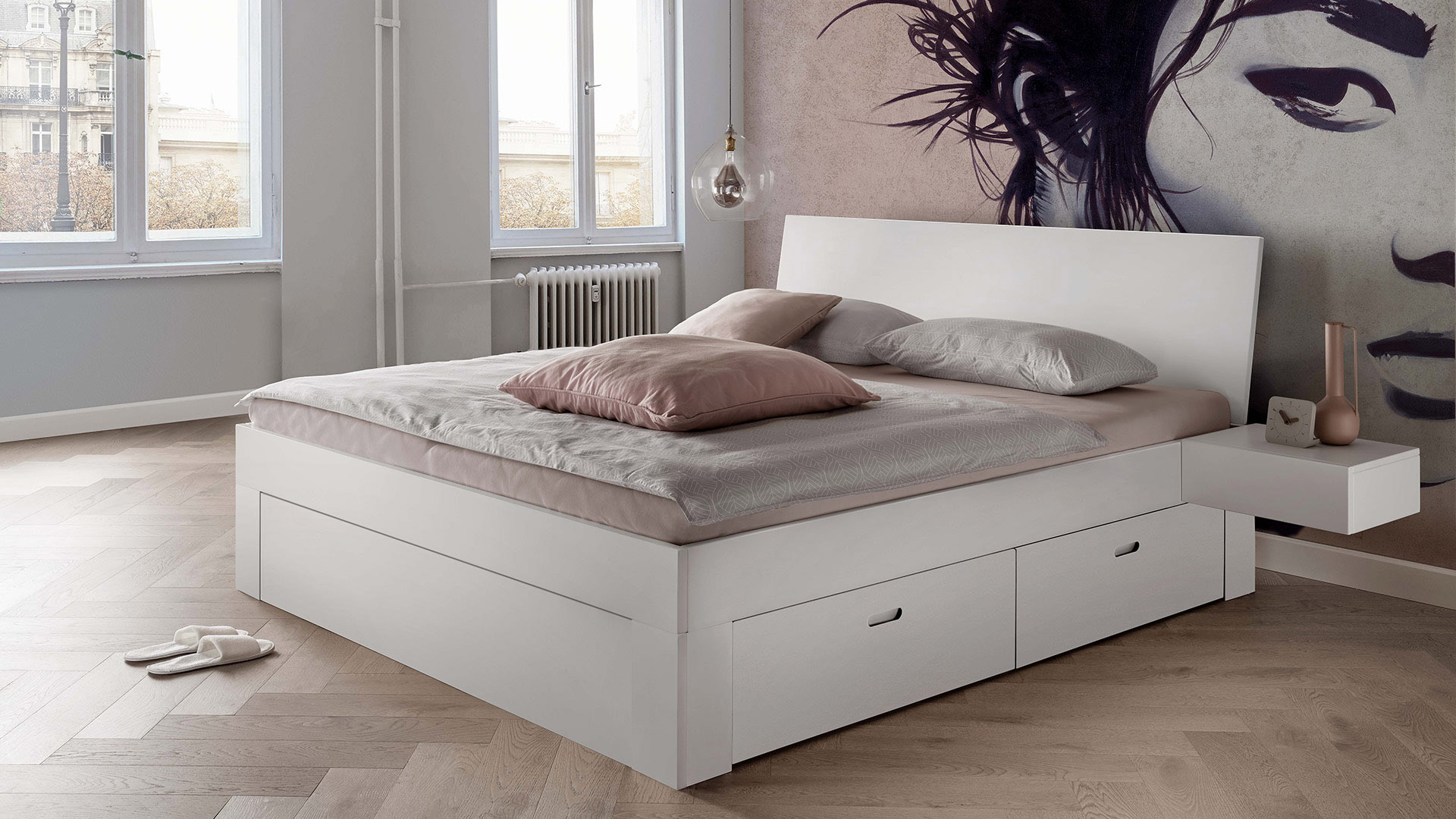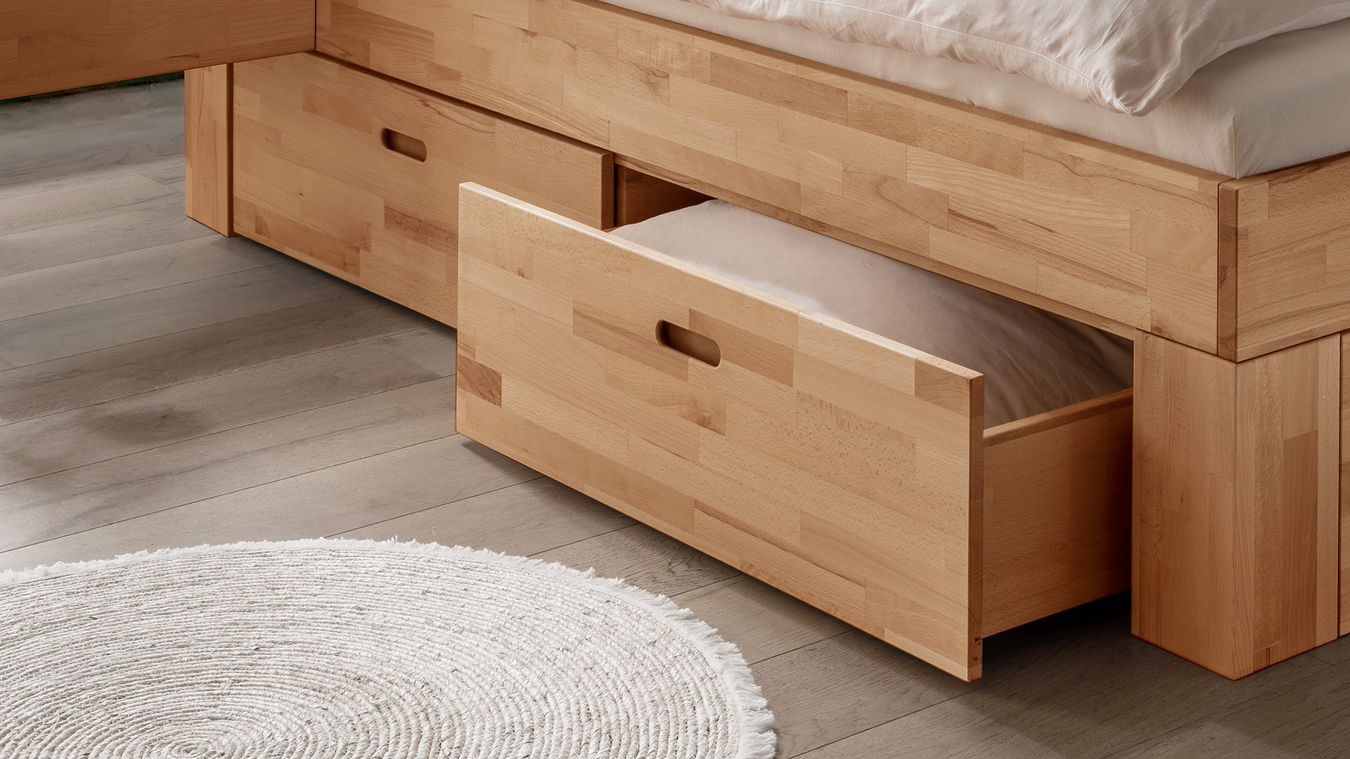 Schubkastenbett "Lunara" schafft in Ihrem Schlafzimmer eine wohltuende, natürliche Atmosphäre und bringt gleichzeitig viel großzügigen Stauraum mit. Je zwei Schubkästen pro Bettseite warten nur darauf, von Ihnen mit Bettwäsche, Bettdecken oder Kleidung befüllt zu werden. Mit fein gearbeiteten Griffmulden an den Schubkästen ist alles schnell und ordentlich verstaut.