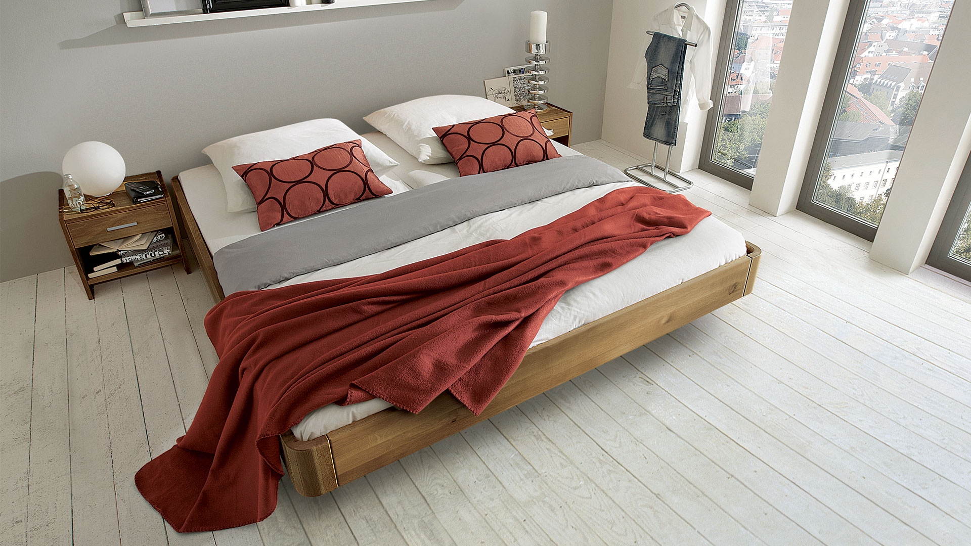 Der Kontrast zwischen natürlichen Hölzern und modernen, markanten Metallkufen! Wählen Sie aus eleganter Kernbuche und markanter Wildeiche Ihr Lieblingsholz. Egal, für was Sie sich entscheiden - die massiven Hölzer sorgen für Stabilität und bringen ein Stück Natur in Ihr Schlafzimmer.