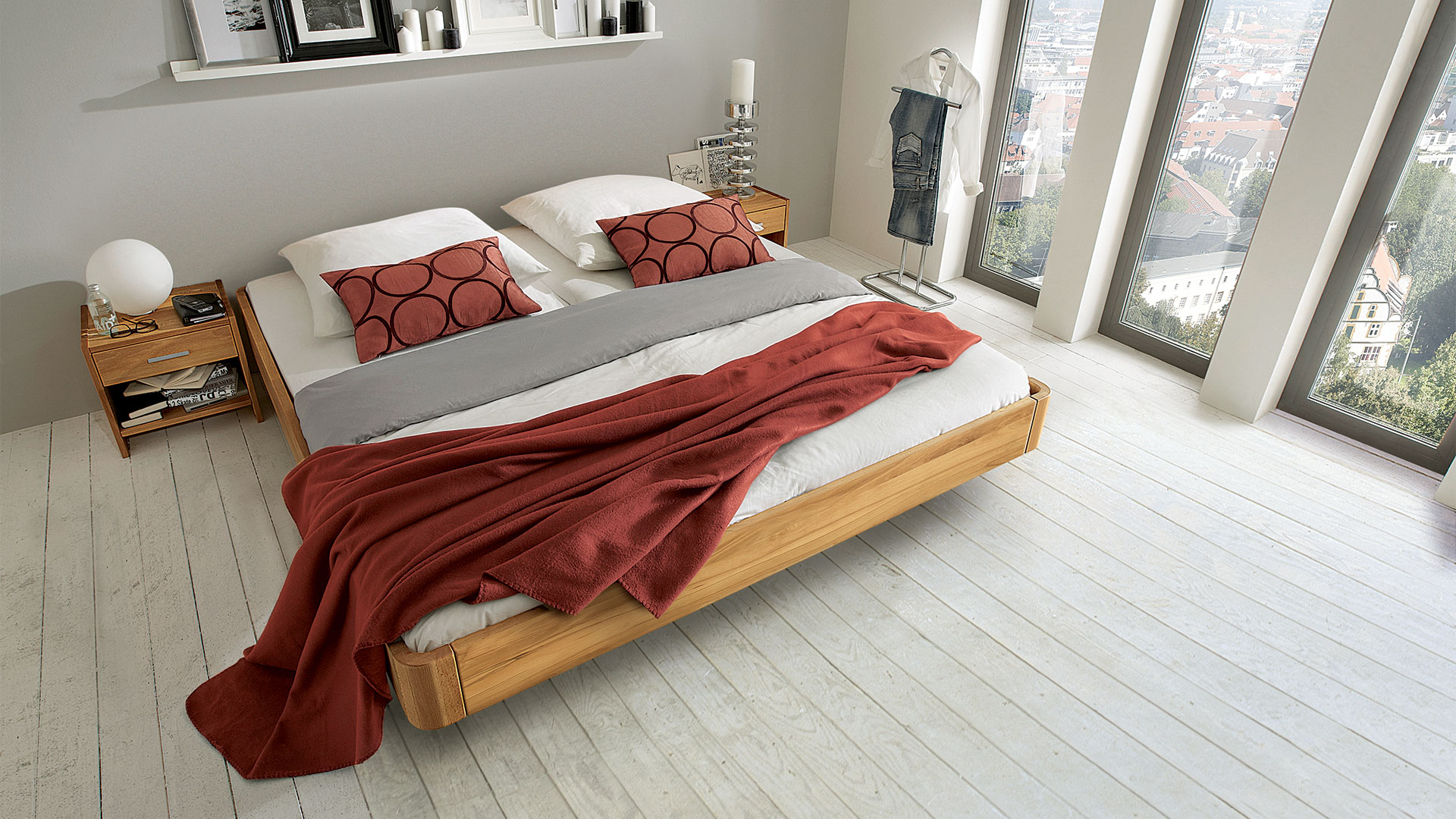 Der Kontrast zwischen natürlichen Hölzern und modernen, markanten Metallkufen! Wählen Sie aus eleganter Kernbuche und markanter Wildeiche Ihr Lieblingsholz. Egal, für was Sie sich entscheiden - die massiven Hölzer sorgen für Stabilität und bringen ein Stück Natur in Ihr Schlafzimmer.