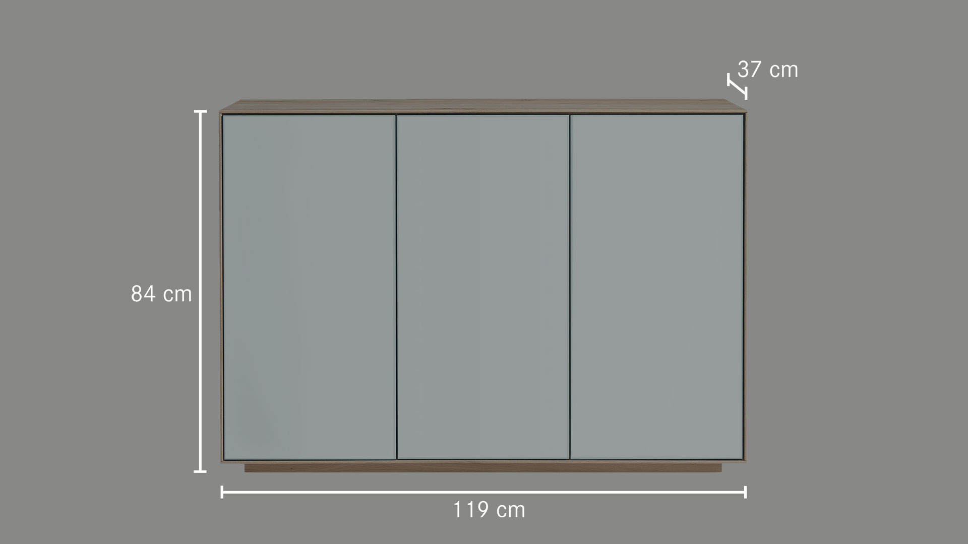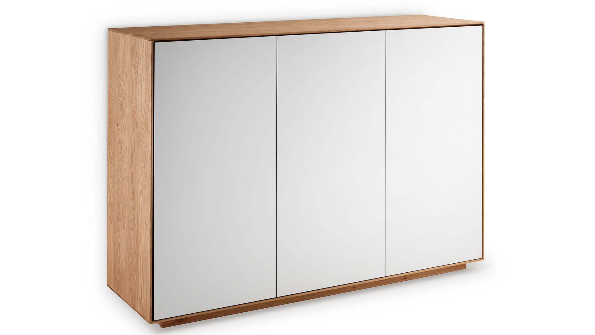 Sideboard "Fiella" bringt Wärme und Eleganz in Ihr Zuhause. Die charaktervolle Maserung der massiven Wildeiche wird durch die Türen aus satiniertem Weißglas stilsicher abgerundet. So verleihen Sie Ihrem Eingangsbereich oder Wohnzimmer eine einladende und unbeschwerte Atmosphäre.