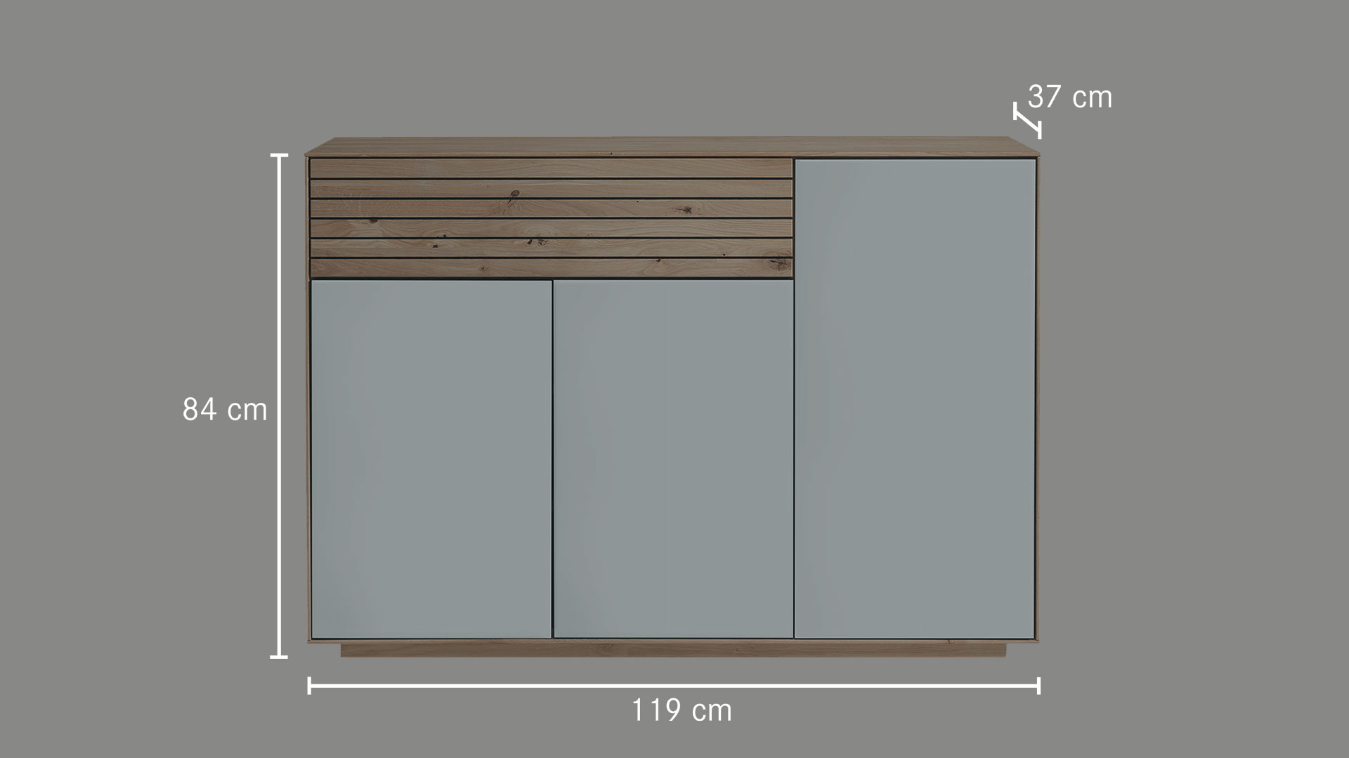 Wenn Sie einen klaren Look bevorzugen, ist die Variante nur mit Glastüren ideal - sie hellt Ihr Zuhause optisch auf und bietet genug Stauraum für Ihre Schätze. Farbliche Akzente schafft die Variante mit Schublade. Ihre Blende ist - wie der Korpus - aus Wildeiche und harmoniert dank der schwarz gebeizten Rillen perfekt mit den klaren Linien des Sideboards. Beide Varianten verbinden Funktionalität mit zeitgemäßem Design und machen "Fiella" zu einem echten Blickfang in jedem Raum.