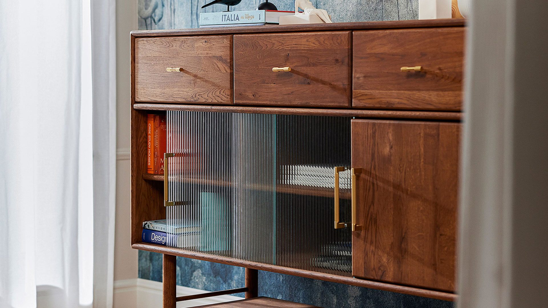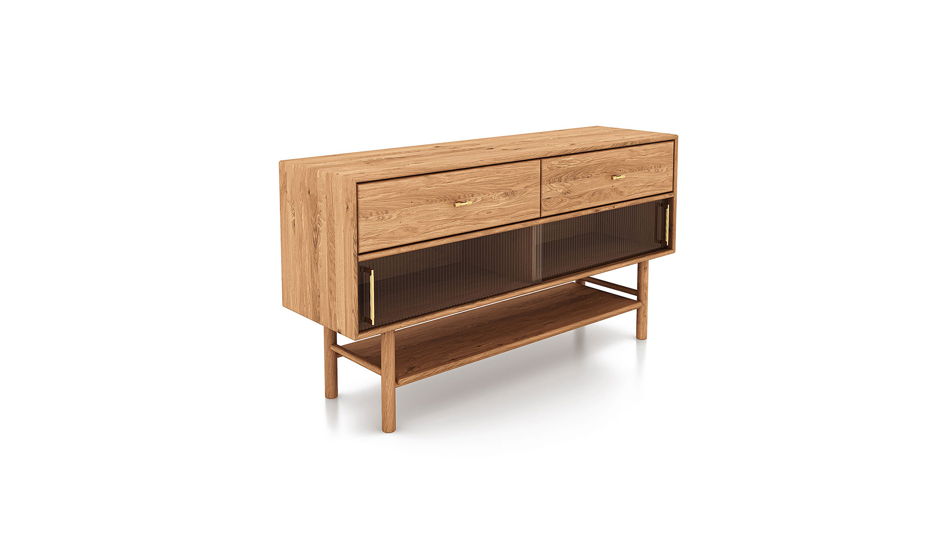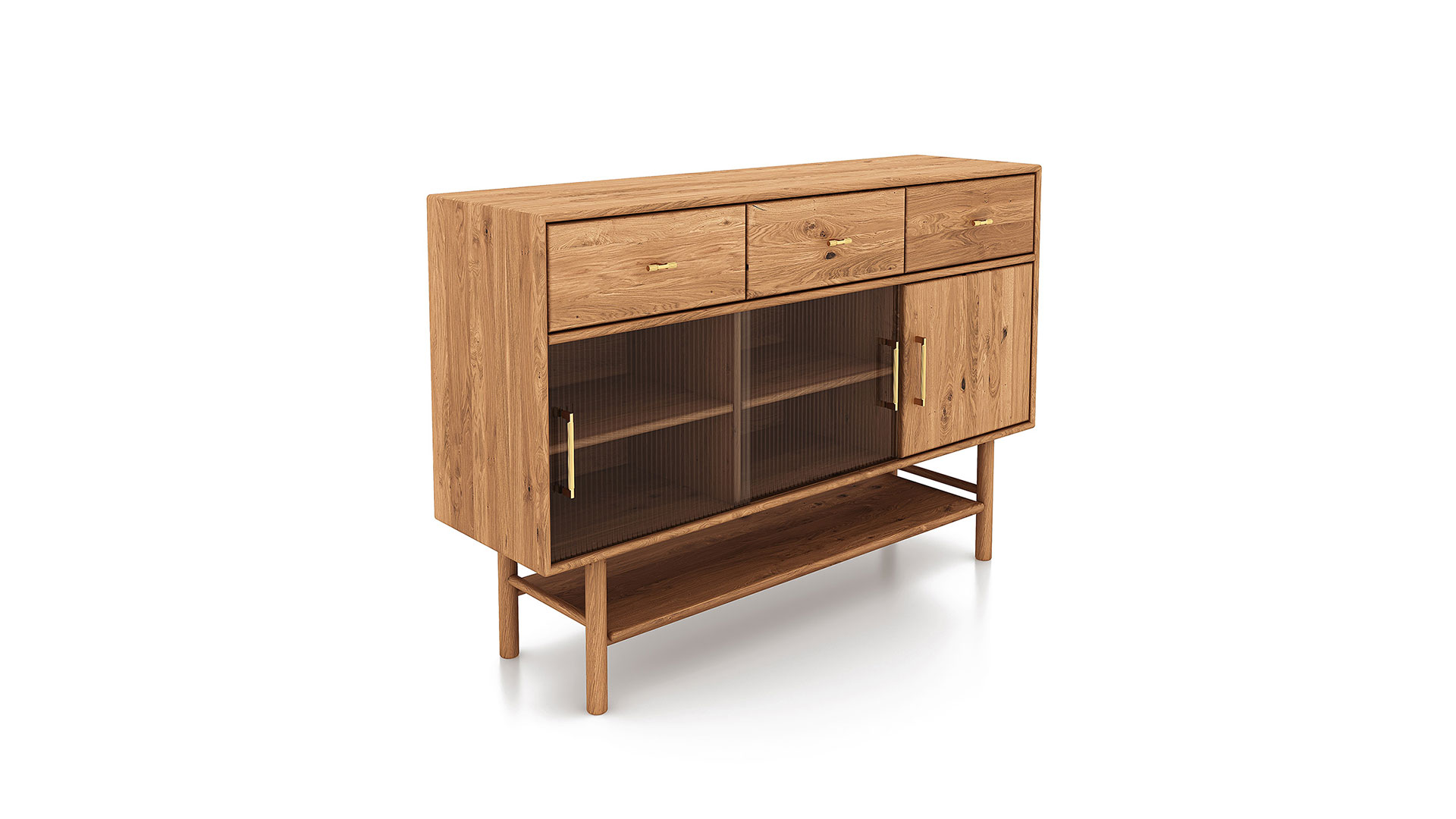 "Serea" bringt die Eleganz des Mid-Century-Designs direkt in Ihr Zuhause. Goldfarbene Griffe, feines Riffelglas und klare Linien verleihen dem Sideboard einen edlen Charakter, der sowohl zeitlos als auch modern wirkt. Varianten mit Glaselementen verfügen zudem über eine integrierte LED-Beleuchtung, die Ihre Lieblingsstücke stimmungsvoll in Szene setzt. Ob mit Türen, Schubladen oder Glasfronten – jede Ausführung überzeugt durch stilvolle Details und praktische Funktionalität.